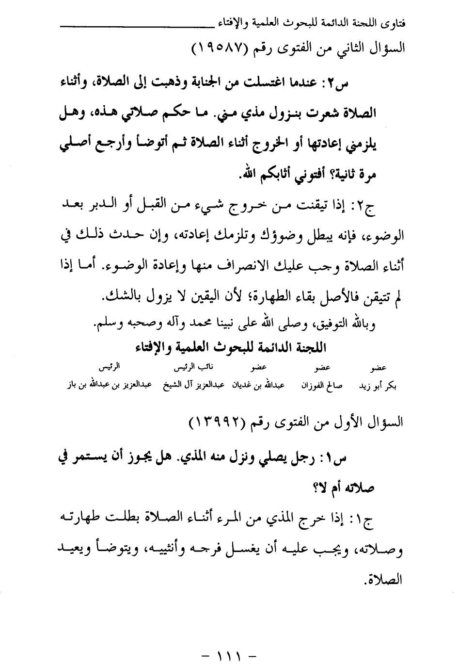 س 2: عندما اغتسلت من الجنابة وذهبت إلى الصلاة، وأثناء الصلاة شعرت بنزول مذي مني. ما حكم صلاتي هذه، وهل يلزمني إعادتها أو الخروج أثناء الصلاة ثم أتوضأ وأرجع أصلي مرة ثانية؟ أفتوني أثابكم الله.