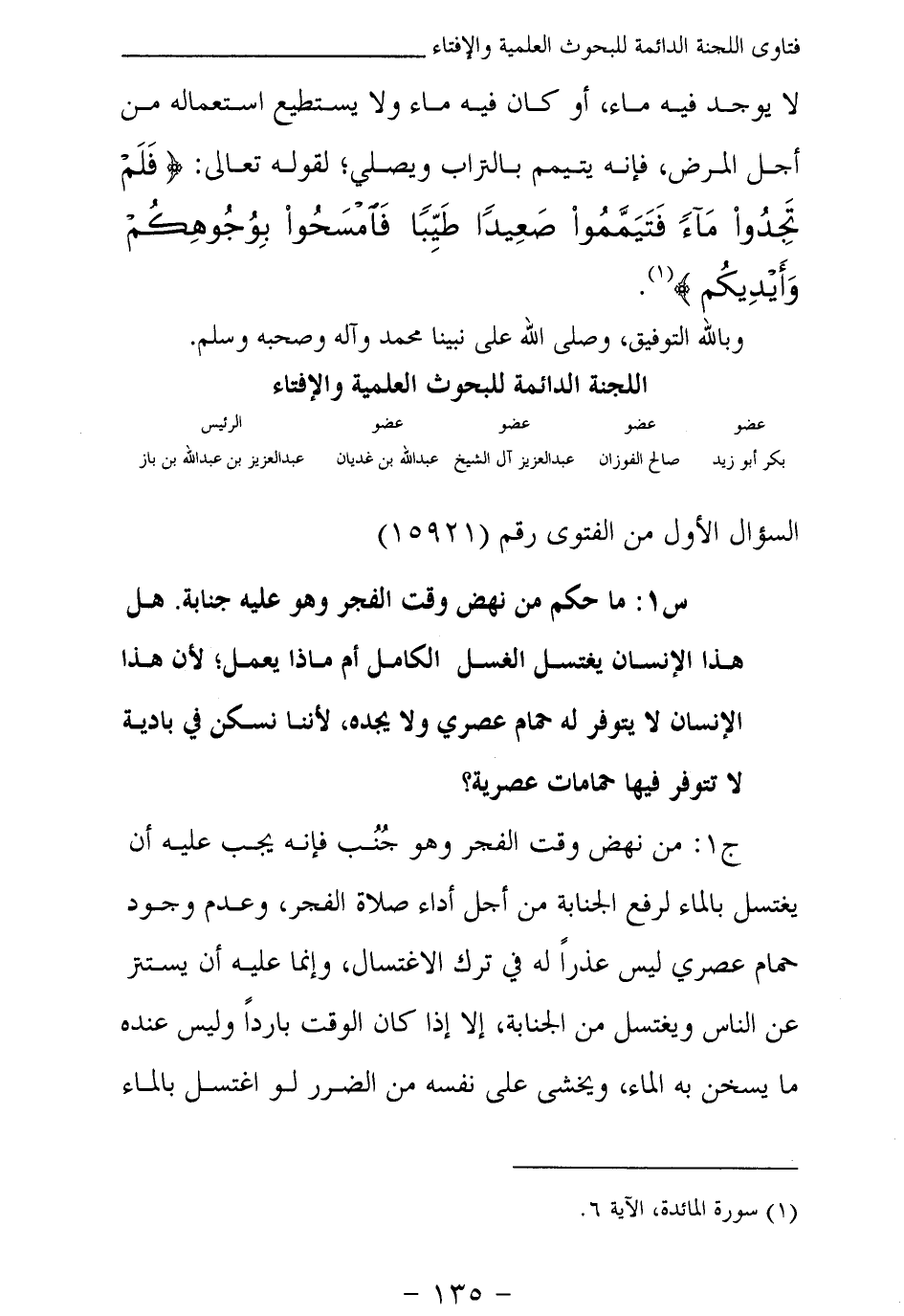 س 1: ما حكم من نهض وقت الفجر وهو عليه جنابة. هل هذا الإنسان يغتسل الغسل الكامل أم ماذا يعمل؛ لأن هذا الإنسان لا يتوفر له حمام عصري ولا يجده، لأننا نسكن في بادية لا تتوفر فيها حمامات عصرية؟