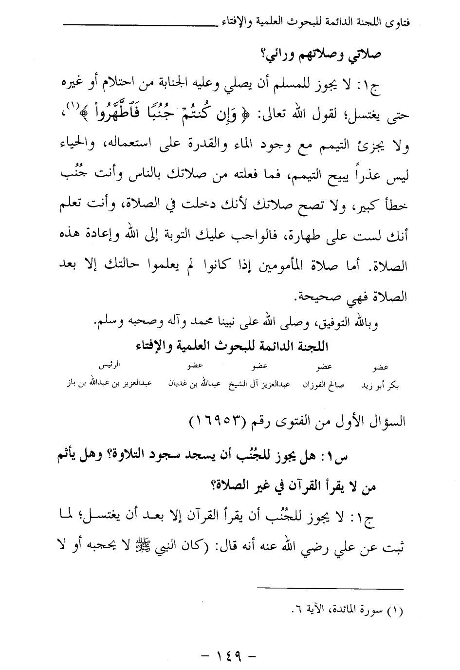 س 1: هل يجوز للجنب أن يسجد سجود التلاوة؟ وهل يأثم من لا يقرأ القرآن في غير الصلاة؟