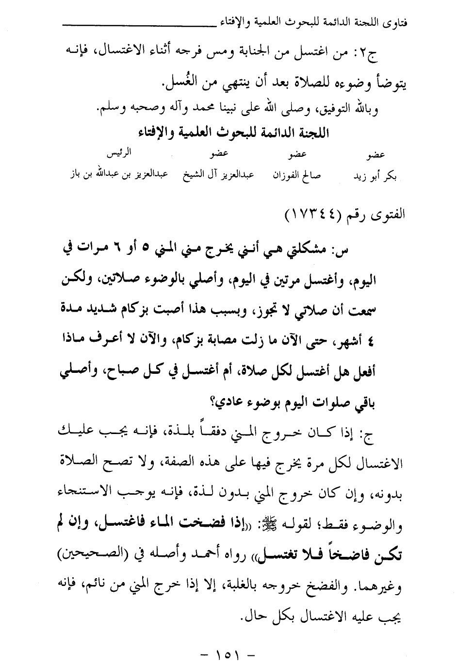 س: مشكلتي هي أنني يخرج مني المني 5 أو 6 مرات في اليوم، وأغتسل مرتين في اليوم، وأصلي بالوضوء صلاتين، ولكن سمعت أن صلاتي لا تجوز، وبسبب هذا أصبت بزكام شديد مدة 4 أشهر، حتى الآن ما زلت مصابة بزكام، والآن لا أعرف ماذا أفعل هل أغتسل لكل صلاة، أم أغتسل في كل صباح، وأصلي باقي صلوات اليوم بوضوء عادي؟