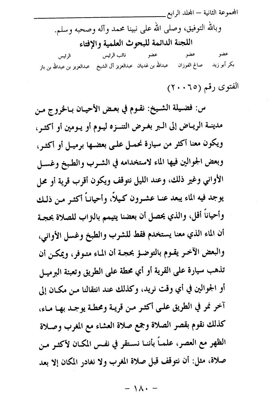 س: فضيلة الشيخ: نقوم في بعض الأحيان بالخروج من مدينة الرياض إلى البر بغرض التنزه ليوم أو يومين أو أكثر، ويكون معنا أكثر من سيارة نحمل على بعضها برميل أو أكثر، وبعض الجوالين فيها الماء لاستخدامه في الشرب والطبخ وغسل الأواني وغير ذلك، وعند الليل نتوقف ويكون أقرب قرية أو محل يوجد فيه الماء يبعد عنا عشرين كيلو، وأحيانا أكثر من ذلك وأحيانا أقل، والذي يحصل أن بعضنا يتيمم بالتراب للصلاة بحجة أن الماء الذي معنا يستخدم فقط للشرب والطبخ وغسل الأواني، والبعض الآخر يقوم بالتوضؤ بحجة أن الماء متوفر، ويمكن أن تذهب سيارة على القرية أو أي محطة على الطريق وتعبئة البرميل أو الجوالين في أي وقت نريد، وكذلك عند انتقالنا من مكان إلى آخر نمر في الطريق على أكثر من قرية ومحطة يوجد بها ماء، كذلك نقوم بقصر الصلاة وجمع صلاة العشاء مع المغرب وصلاة الظهر مع العصر، علما بأننا نستقر في نفس المكان لأكثر من صلاة، مثل: أن نتوقف قبل صلاة المغرب ولا نغادر المكان إلا بعد