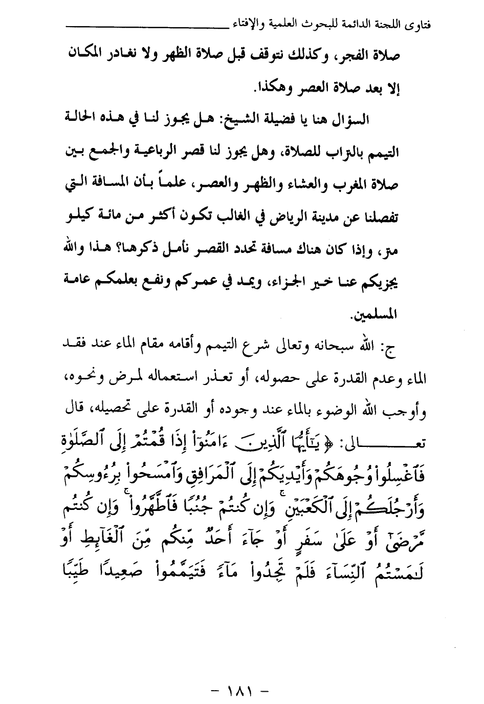 السؤال هنا يا فضيلة الشيخ: هل يجوز لنا في هذه الحالة التيمم بالتراب للصلاة، وهل يجوز لنا قصر الرباعية والجمع بين صلاة المغرب والعشاء والظهر والعصر، علما بأن المسافة التي تفصلنا عن مدينة الرياض في الغالب تكون أكثر من مائة كيلو مترا، وإذا كان هناك مسافة تحدد القصر نأمل ذكرها؟ هذا والله يجزيكم عنا خير الجزاء، ويمد في عمركم ونفع بعلمكم عامة المسلمين.