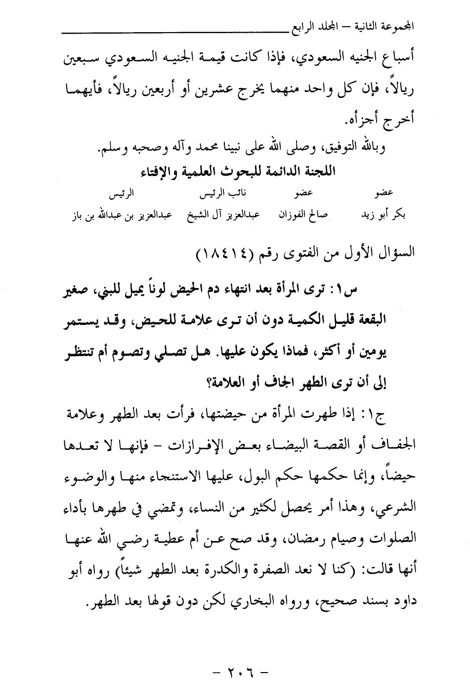 س1: ترى المرأة بعد انتهاء دم الحيض لونا يميل للبني، صغير البقعة قليل الكمية دون أن ترى علامة للحيض، وقد يستمر يومين أو أكثر، فماذا يكون عليها. هل تصلي وتصوم أم تنتظر إلى أن ترى الطهر الجاف أو العلامة؟