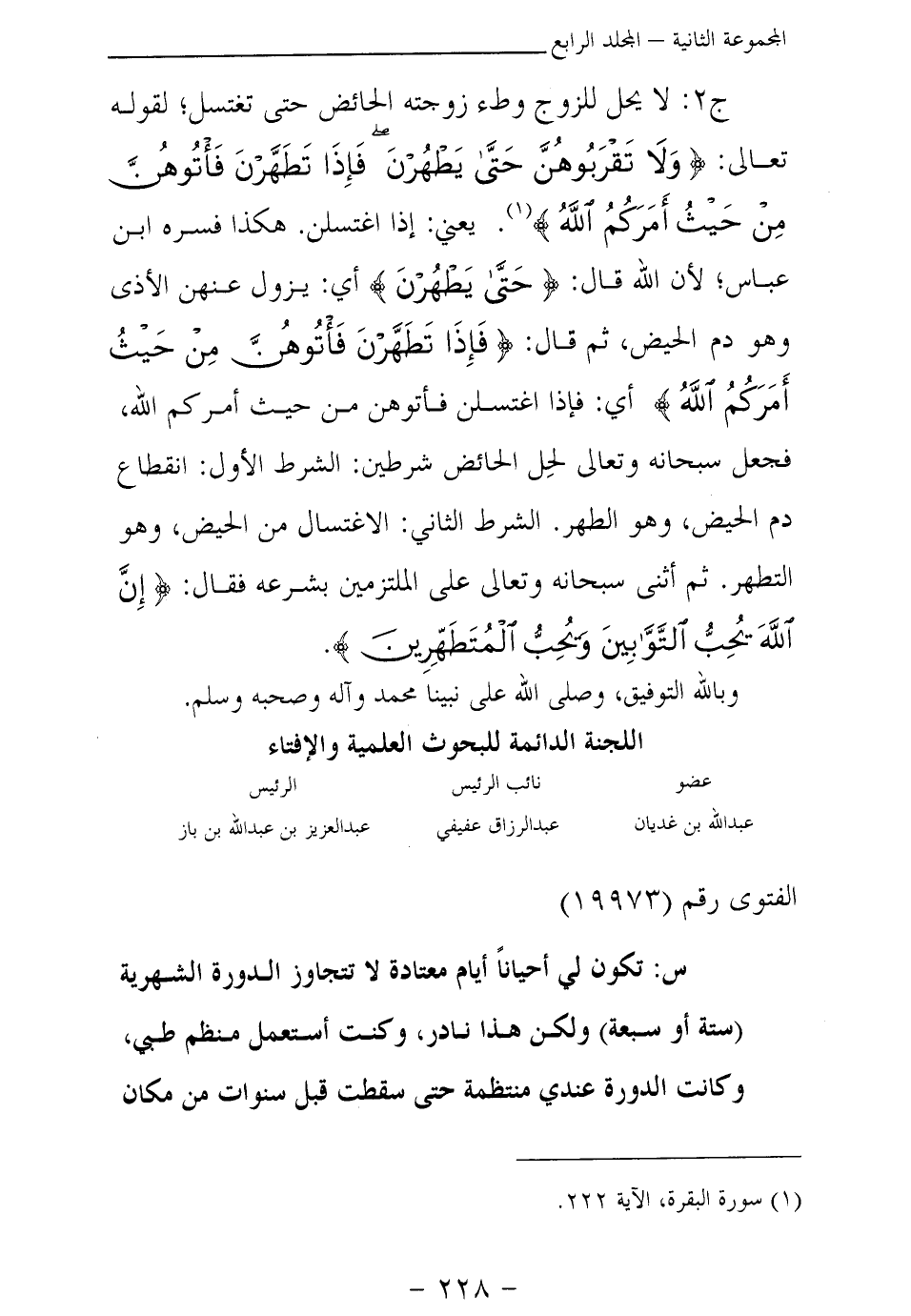 س: تكون لي أحيانا أيام معتادة لا تتجاوز الدورة الشهرية (ستة أو سبعة) ولكن هذا نادر، وكنت أستعمل منظم طبي، وكانت الدورة عندي منتظمة حتى سقطت قبل سنوات من مكان