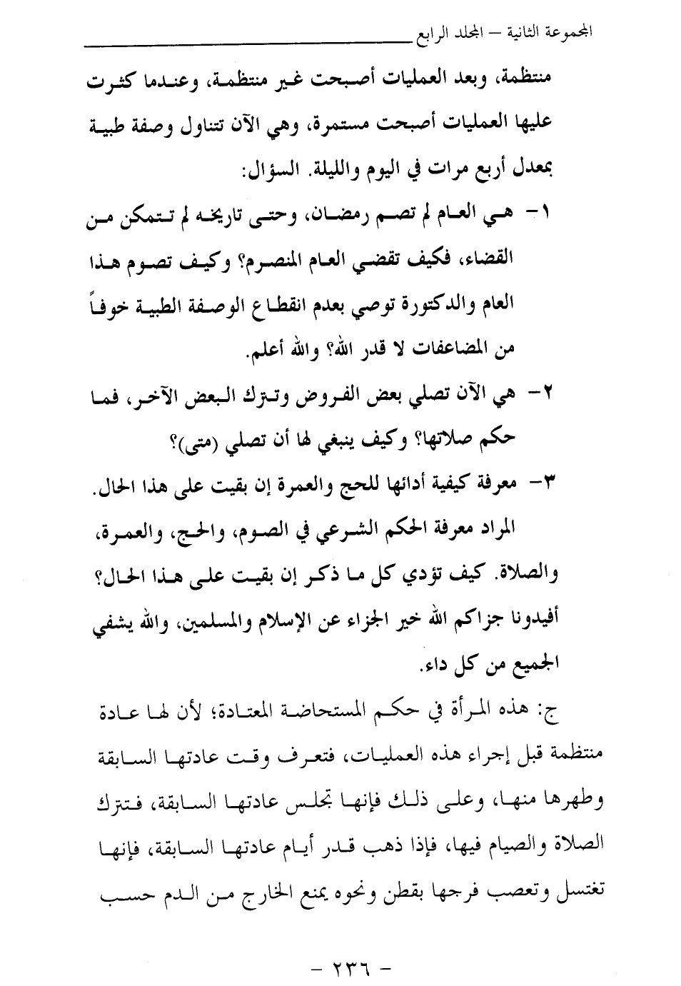 منتظمة، وبعد العمليات أصبحت غير منتظمة، وعندما كثرت عليها العمليات أصبحت مستمرة، وهي الآن تتناول وصفة طبية بمعدل أربع مرات في اليوم والليلة. السؤال: