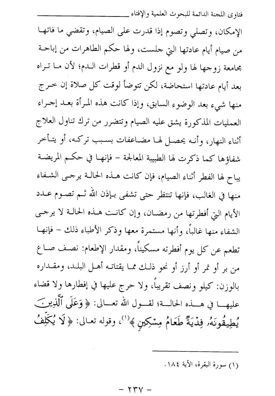 الإمكان، وتصلي وتصوم إذا قدرت على الصيام، وتقضي ما فاتها من صيام أيام عادتها التي جلست، ولها حكم الطاهرات من إباحة مجامعة زوجها لها ولو مع نزول الدم أو قطرات الدم؛ لأن ما تراه بعد أيام عادتها استحاضة؛ لكن تتوضأ لوقت كل صلاة إن خرج منها شيء بعد الوضوء السابق؛ وإذا كانت هذه المرأة بعد إجراء العمليات المذكورة يشق عليه الصيام وتتضرر من ترك تناول العلاج أثناء النهار، وأنه يحصل لها مضاعفات بسبب تركه، أو يتأخر شفاؤها كما ذكرت لها الطبيبة المعالجة - فإنها في حكم المريضة يباح لها الفطر أثناء الصيام، فإن كانت هذه الحالة يرجى الشفاء منها في الغالب، فإنها تنتظر حتى تشفى بإذن الله ثم تصوم عدد الأيام التي أفطرتها من رمضان، وإن كانت هذه الحالة لا يرجى الشفاء منها غالبا، وأنها مستمرة معها وذكر الأطباء ذلك - فإنها تطعم عن كل يوم أفطرته مسكينا، ومقدار الإطعام: نصف صاع من بر أو تمر أو أرز أو نحو ذلك مما يقتاته أهل البلد، ومقداره بالوزن: كيلو ونصف تقريبا، ولا حرج عليها في إفطارها ولا قضاء عليها في هذه الحالة؛ لقول الله تعالى {وَعَلَى الَّذِينَ يُطِيقُونَهُ فِدْيَةٌ طَعَامُ مِسْكِينٍ} (¬1) ،