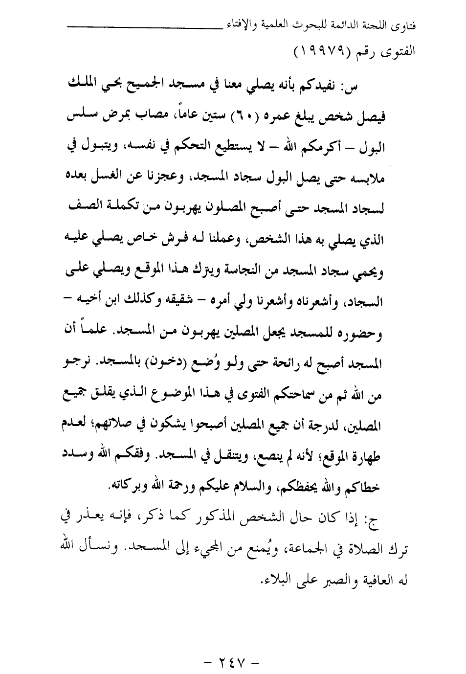 س: نفيدكم بأنه يصلي معنا في مسجد الجميح بحي الملك فيصل شخص يبلغ عمره (60) ستين عاما، مصاب بمرض سلس البول - أكرمكم الله - لا يستطيع التحكم في نفسه، ويتبول في ملابسه حتى يصل البول سجاد المسجد، وعجزنا عن الغسل بعده لسجاد المسجد حتى أصبح المصلون يهربون من تكملة الصف الذي يصلي به هذا الشخص، وعملنا له فرشا خاصا يصلي عليه، ويحمي سجاد المسجد من النجاسة ويترك هذا الموقع ويصلي على السجاد، وأشعرناه وأشعرنا ولي أمره - شقيقه وكذلك ابن أخيه - وحضوره للمسجد يجعل المصلين يهربون من المسجد. علما أن المسجد أصبح له رائحة حتى ولو وضع (دخون) بالمسجد. نرجو من الله ثم من سماحتكم الفتوى في هذا الموضوع الذي يقلق جميع المسلمين، لدرجة أن جميع المصلين أصبحوا يشكون في صلاتهم؛ لعدم طهارة الموقع؛ لأنه لم ينصع، ويتنقل في المسجد. وفقكم الله وسدد خطاكم والله يحفظكم، والسلام عليكم ورحمة الله وبركاته.