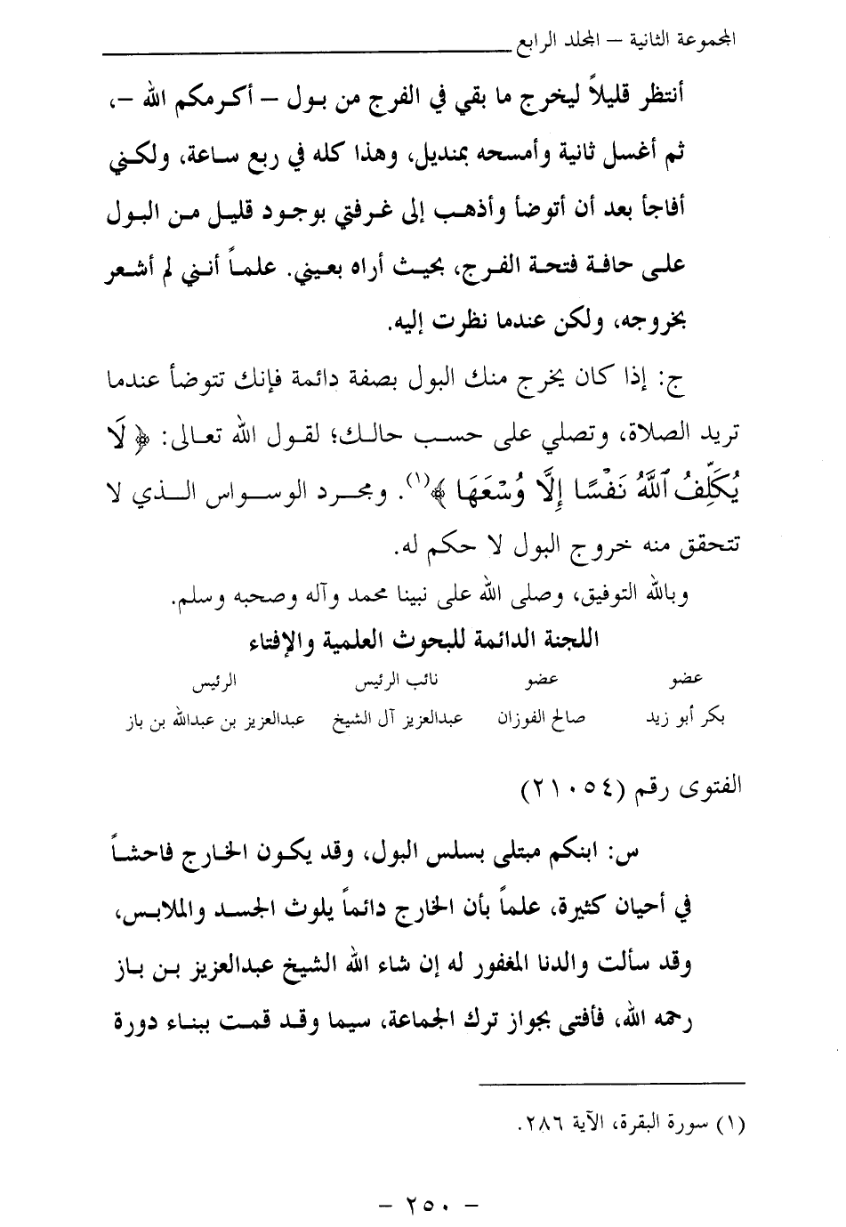 س: ابنكم مبتلى بسلس البول، وقد يكون الخارج فاحشا في أحيان كثيرة، علما بأن الخارج دائما يلوث الجسد والملابس، وقد سألت والدنا المغفور له إن شاء الله الشيخ عبد العزيز بن باز رحمه الله، فأفتى بجواز ترك الجماعة، سيما وقد قمت ببناء دورة