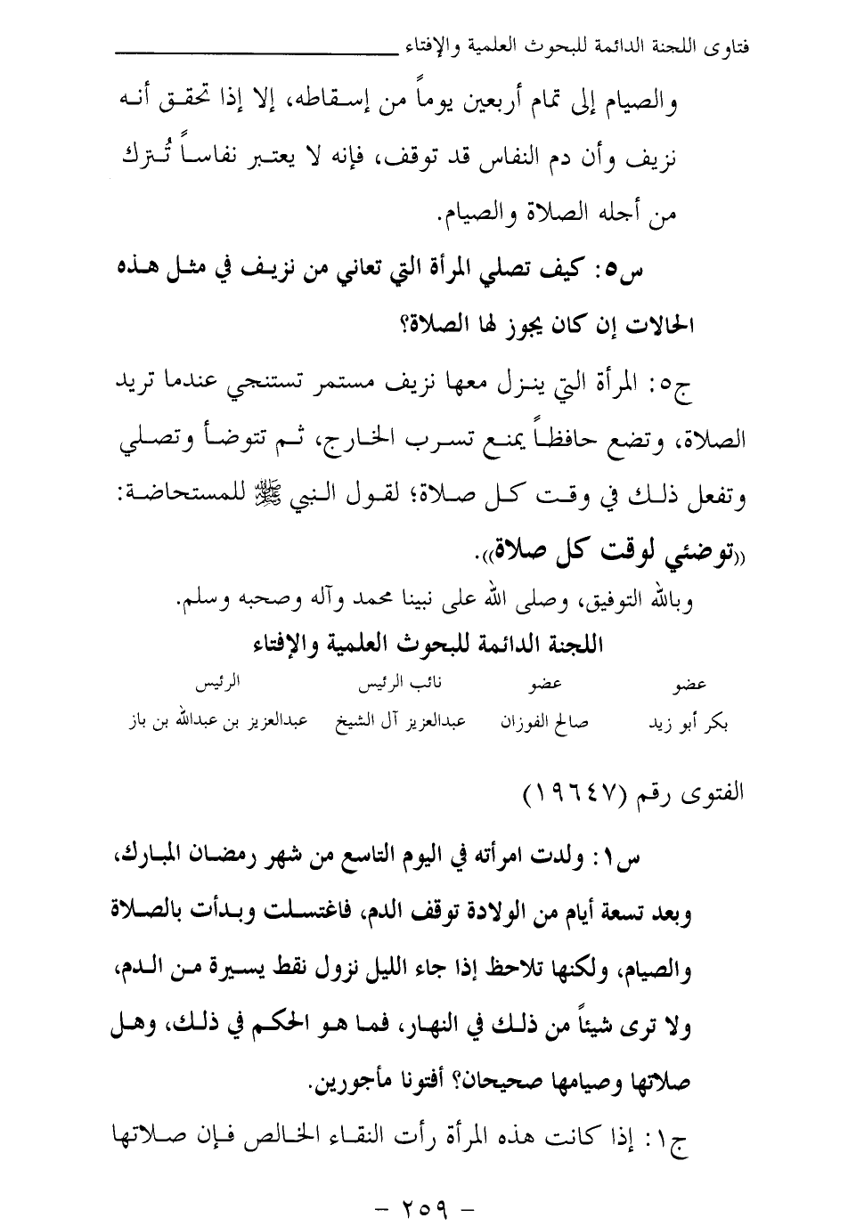 س1: ولدت امرأته في اليوم التاسع من شهر رمضان المبارك، وبعد تسعة أيام من الولادة توقف الدم، فاغتسلت وبدأت بالصلاة والصيام، ولكنها تلاحظ إذا جاء الليل نزول نقط يسيرة من الدم، ولا ترى شيئا من ذلك في النهار، فما هو الحكم في ذلك، وهل صلاتها وصيامها صحيحان؟ أفتونا مأجورين.
