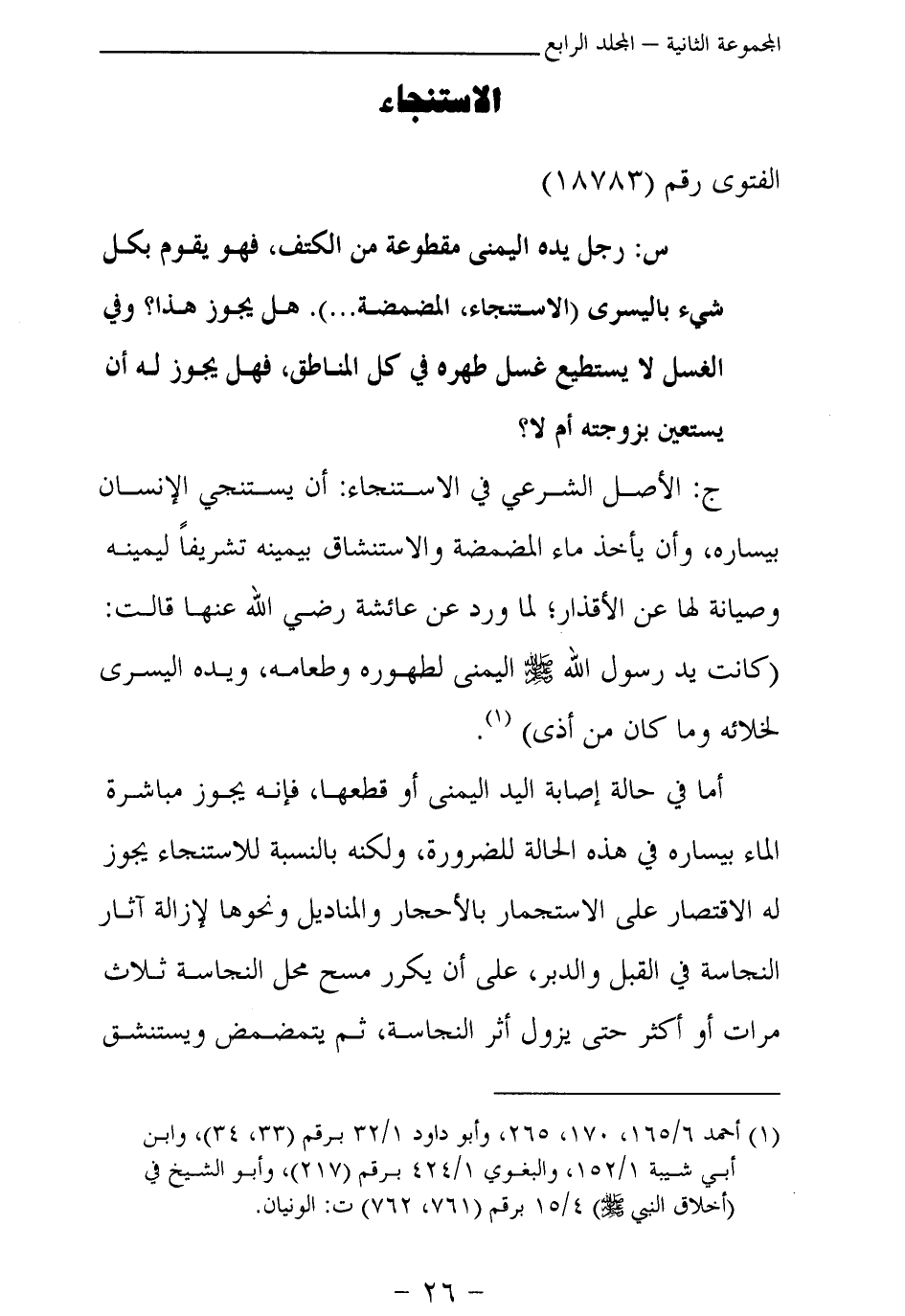 س: رجل يده اليمنى مقطوعة من الكتف، فهو يقوم بكل شيء باليسرى (الاستنجاء، المضمضة. . .) . هل يجوز هذا؟ وفي الغسل لا يستطيع غسل طهره في كل المناطق، فهل يجوز له أن يستعين بزوجته أم لا؟