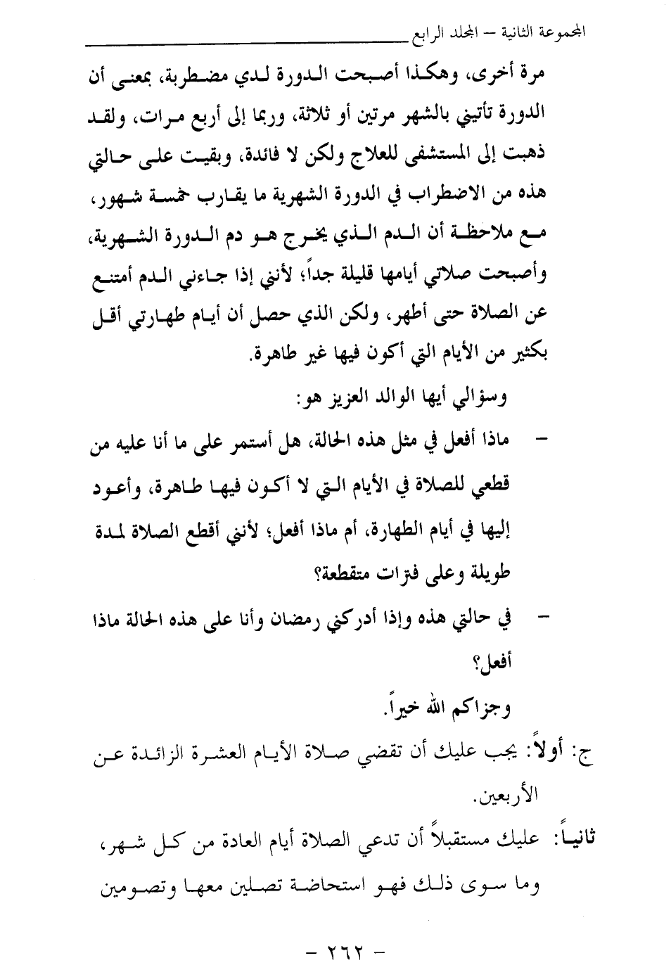 مرة أخرى، وهكذا أصبحت الدورة لدي مضطربة، بمعنى أن الدورة تأتيني بالشهر مرتين أو ثلاثة، وربما إلى أربع مرات، ولقد ذهبت إلى المستشفى للعلاج ولكن لا فائدة، وبقيت على حالتي هذه من الاضطراب في الدورة الشهرية ما يقارب خمسة شهور، مع ملاحظة أن الدم الذي يخرج هو دم الدورة الشهرية، وأصبحت صلاتي أيامها قليلة جدا؛ لأنني إذا جاءني الدم أمتنع عن الصلاة حتى أطهر، ولكن الذي حصل أن أيام طهارتي أقل بكثير من الأيام التي أكون فيها غير طاهرة.