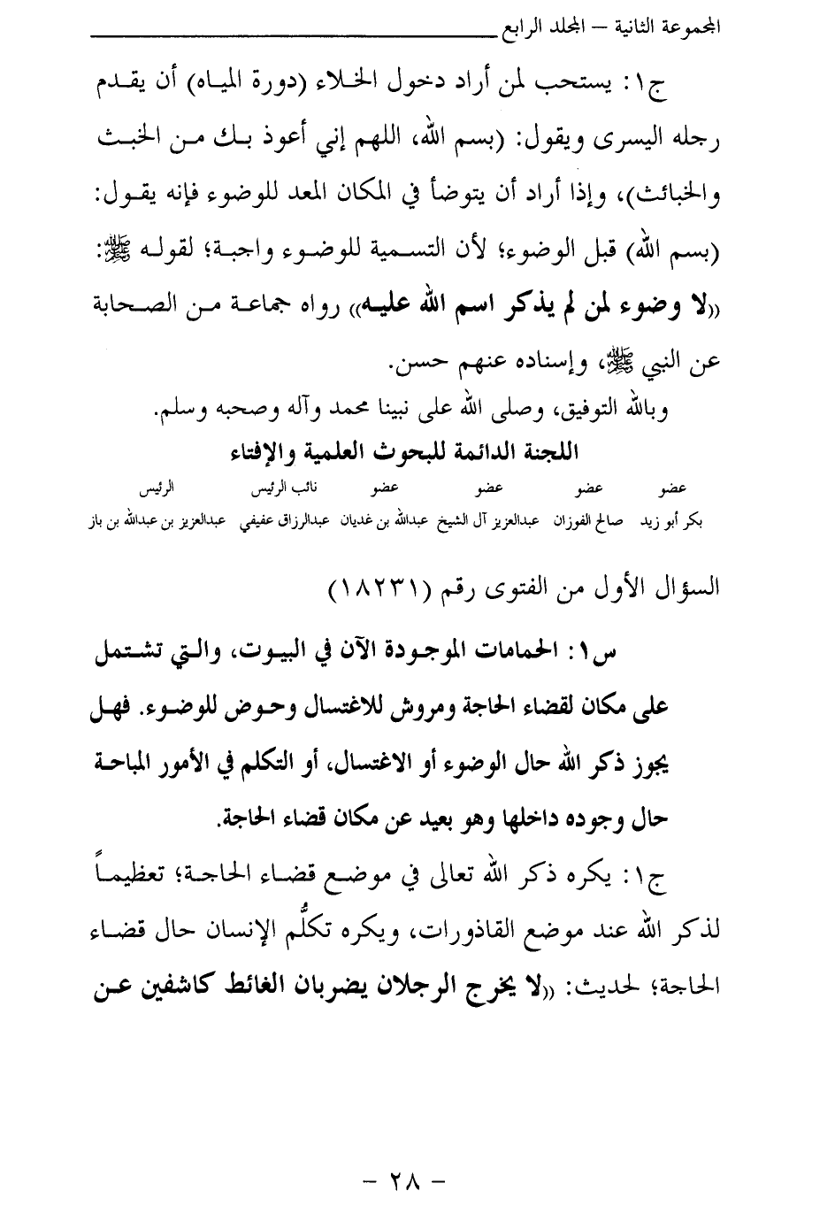 س1: الحمامات الموجودة الآن في البيوت، والتي تشتمل على مكان لقضاء الحاجة ومروش للاغتسال وحوض للوضوء فهل يجوز ذكر الله حال الوضوء أو الاغتسال، أو التكلم في الأمور المباحة حال وجوده داخلها وهو بعيد عن مكان قضاء الحاجة؟