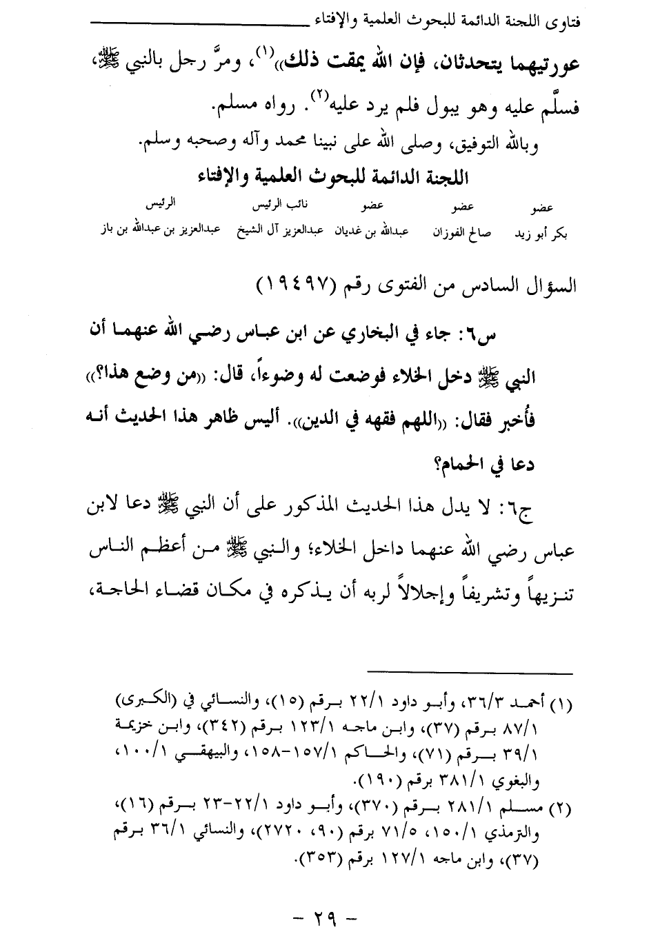 ج 6: لا يدل هذا الحديث المذكور على أن النبي صلى الله عليه وسلم دعا لابن عباس رضي الله عنهما داخل الخلاء؟ والنبي صلى الله عليه وسلم من أعظم الناس تنزيها وتشريفا وإجلالا لربه أن يذكره في مكان قضاء الحاجة.