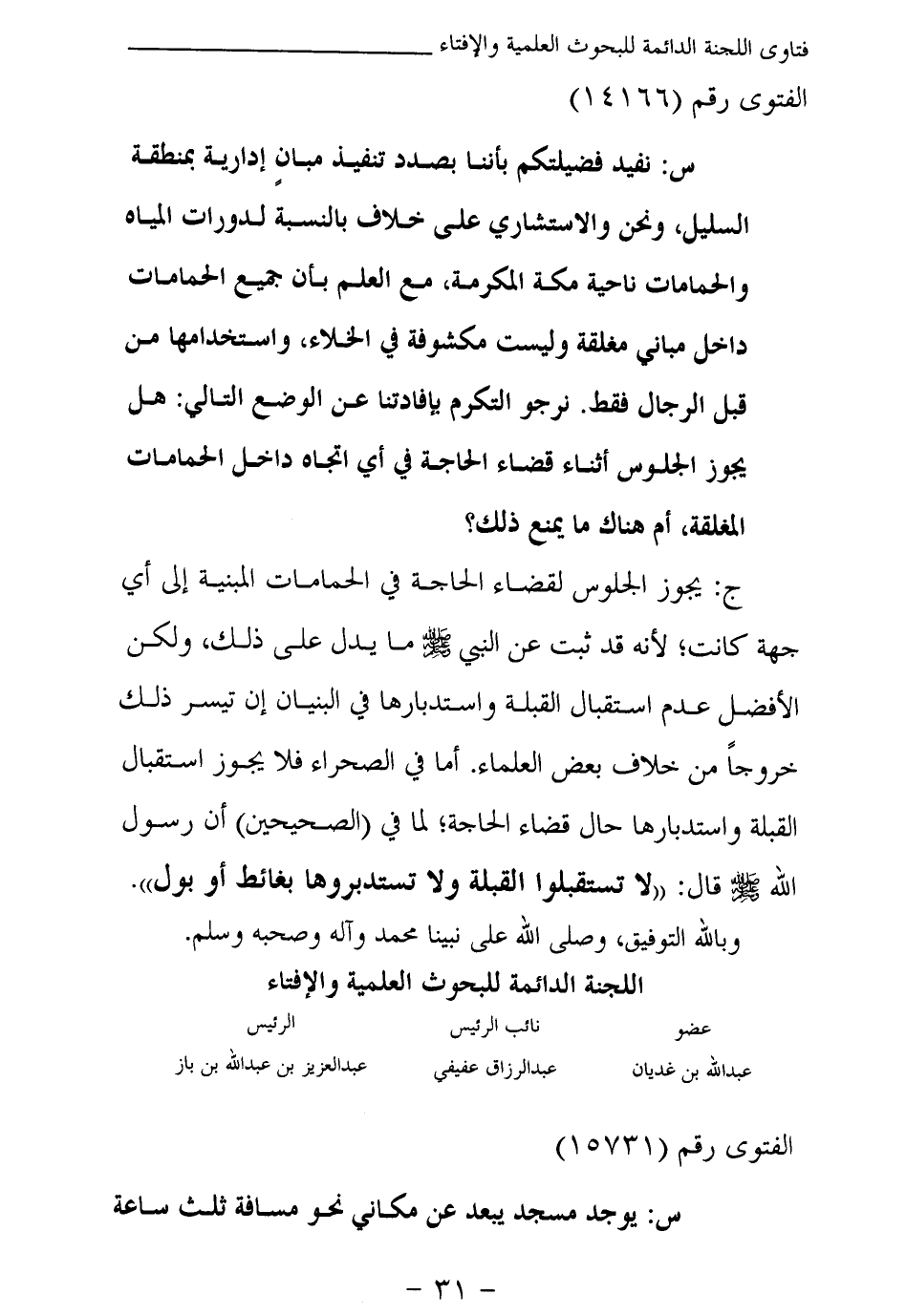 س: نفيد فضيلتكم بأننا بصدد تنفيذ مبان إدارية بمنطقة السليل، ونحن والاستشاري على خلاف بالنسبة لدورات المياه والحمامات ناحية مكة المكرمة، مع العلم بأن جميع الحمامات داخل مبان مغلقة وليست مكشوفة في الخلاء، واستخدامها من قبل الرجال فقط. نرجو التكرم بإفادتنا عن الوضع التالي: هل يجوز الجلوس أثناء قضاء الحاجة في أي اتجاه داخل الحمامات المغلقة، أم هناك ما يمنع ذلك؟