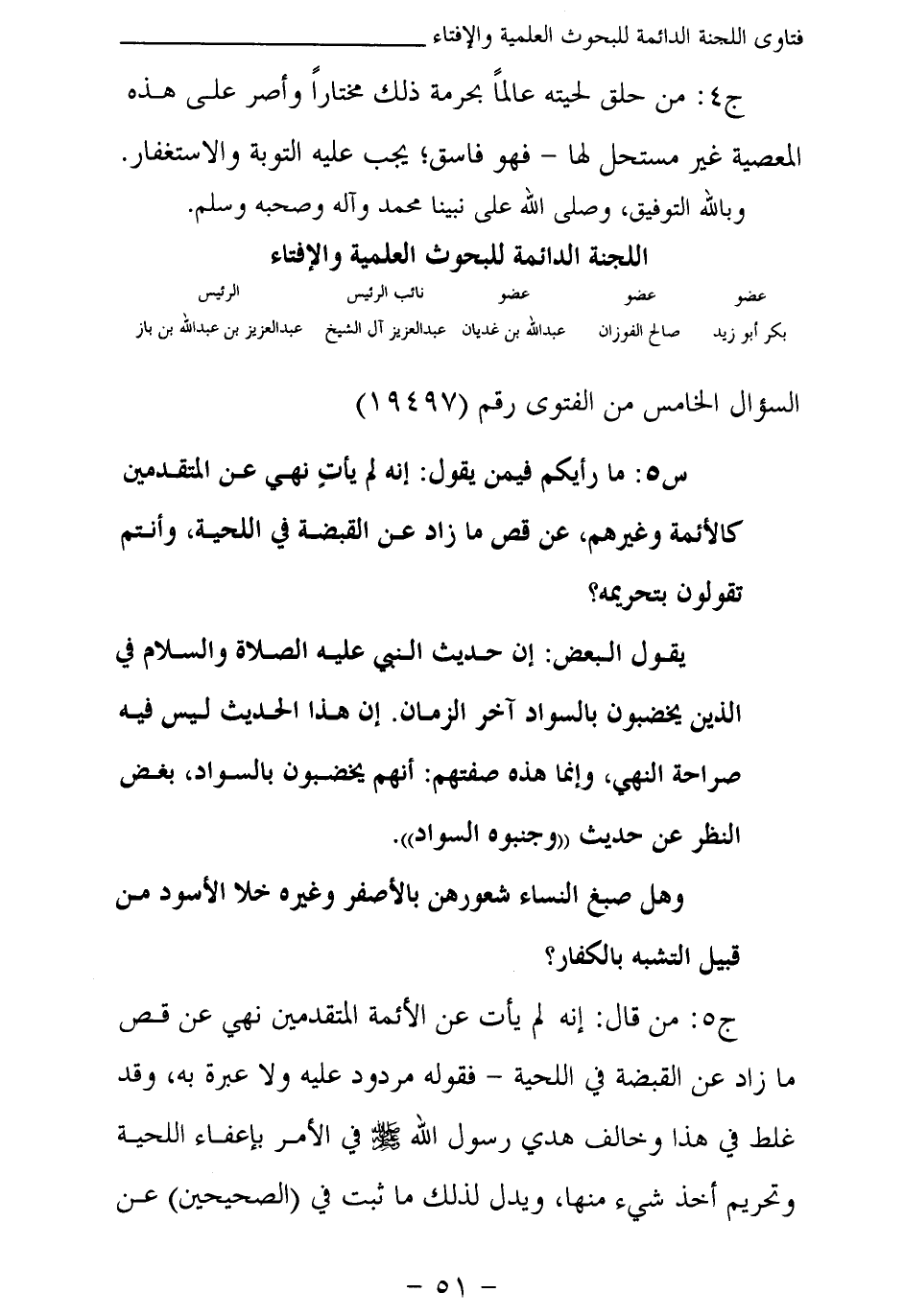 ج 5: من قال: إنه لم يأت عن الأئمة المتقدمين نهي عن قص ما زاد عن القبضة في اللحية - فقوله مردود عليه ولا عبرة به، وقد غلط في هذا وخالف هدي رسول الله صلى الله عليه وسلم في الأمر بإعفاء اللحية وتحريم أخذ شيء منها، ويدل لذلك ما ثبت في (الصحيحين) عن