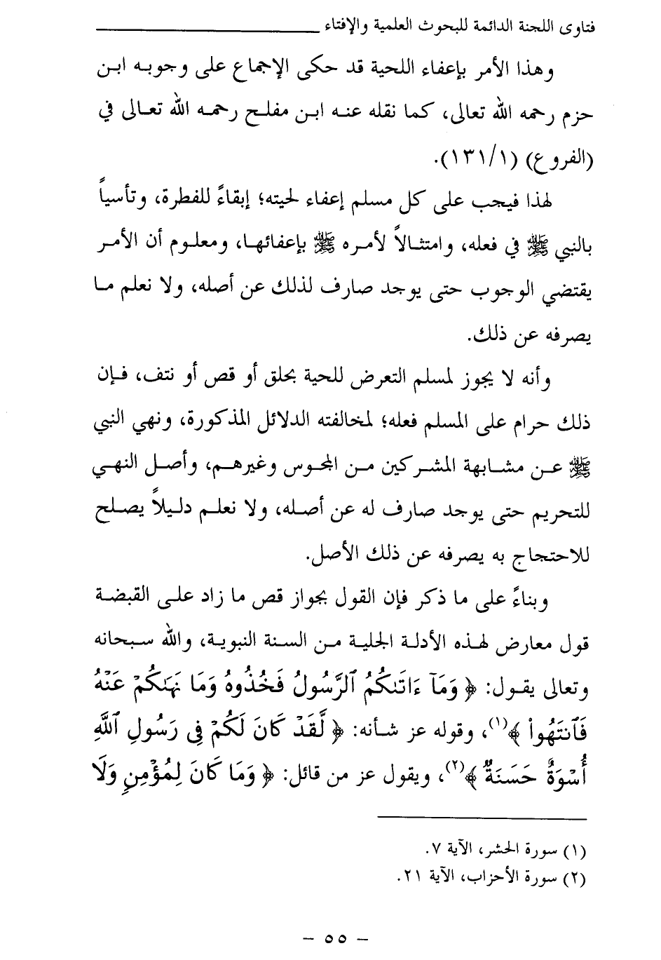 وبناء على ما ذكر فإن القول بجواز قص ما زاد على القبضة قول معارض لهذه الأدلة الجلية من السنة النبوية، والله سبحانه وتعالى يقول: {وَمَا آتَاكُمُ الرَّسُولُ فَخُذُوهُ وَمَا نَهَاكُمْ عَنْهُ فَانْتَهُوا} (¬1) ، وقوله عز شأنه: {لَقَدْ كَانَ لَكُمْ فِي رَسُولِ اللَّهِ أُسْوَةٌ حَسَنَةٌ} (¬2) ، ويقول عز من قائل: