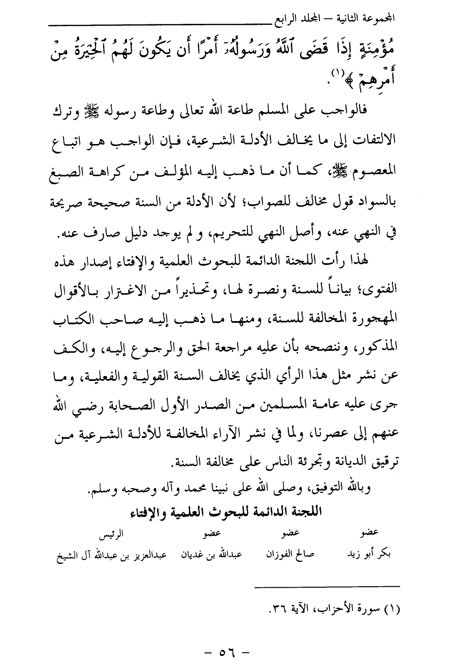 لهذا رأت اللجنة الدائمة للبحوث العلمية والإفتاء إصدار هذه الفتوى؛ بيانا للسنة ونصرة لها وتحذيرا من الاغترار بالأقوال المهجورة المخالفة للسنة، ومنها ما ذهب إليه صاحب الكتاب المذكور، وننصحه بأن عليه مراجعة الحق والرجوع إليه، والكف عن نشر مثل هذا الرأي الذي يخالف السنة القولية والفعلية، وما جرى عليه عامة المسلمين من الصدر الأول الصحابة رضي الله عنهم إلى عصرنا، ولما في نشر الآراء المخالفة للأدلة الشرعية من ترقيق الديانة وتجرئة الناس على مخالفة السنة.