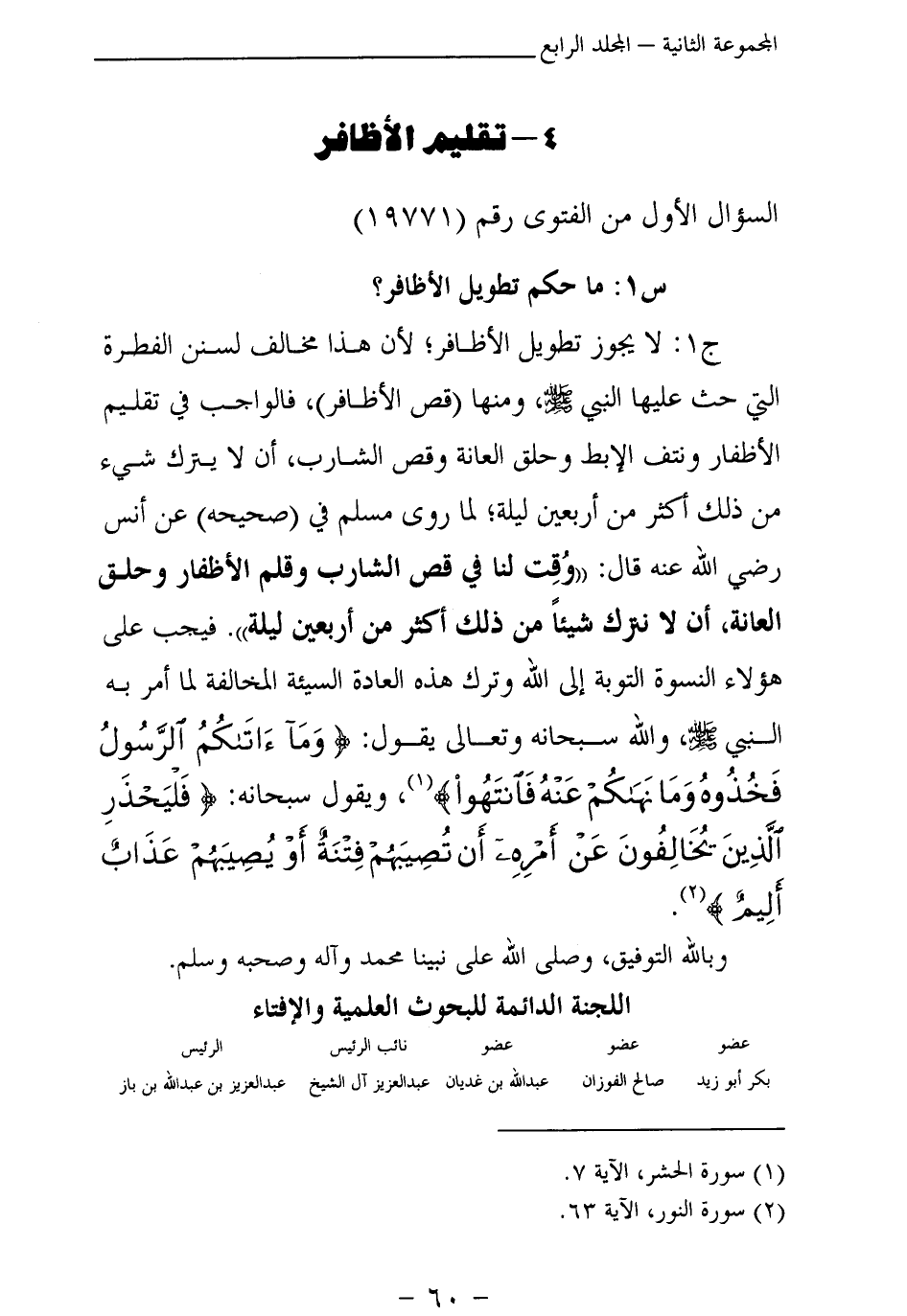 ج 1: لا يجوز تطويل الأظافر؛ لأن هذا مخالف لسنن الفطرة التي حث عليها النبي صلى الله عليه وسلم ومنها (قص الأظافر) فالواجب في تقليم الأظفار ونتف الإبط وحلق العانة وقص الشارب، أن لا يترك شيء من ذلك أكثر من أربعين ليلة؛ لما روى مسلم في (صحيحه) عن أنس رضي الله عنه قال: «وقت لنا في قص الشارب وقلم الأظفار وحلق العانة، أن لا نترك شيئا من ذلك أكثر من أربعين ليلة (¬1) » فيجب على هؤلاء النسوة التوبة إلى الله وترك هذه العادة السيئة المخالفة لما أمر به النبي صلى الله عليه وسلم، والله سبحانه وتعالى يقول: {وَمَا آتَاكُمُ الرَّسُولُ فَخُذُوهُ وَمَا نَهَاكُمْ عَنْهُ فَانْتَهُوا} (¬2) ، ويقول سبحانه: {فَلْيَحْذَرِ الَّذِينَ يُخَالِفُونَ عَنْ أَمْرِهِ أَنْ تُصِيبَهُمْ فِتْنَةٌ أَوْ يُصِيبَهُمْ عَذَابٌ أَلِيمٌ} (¬3) .