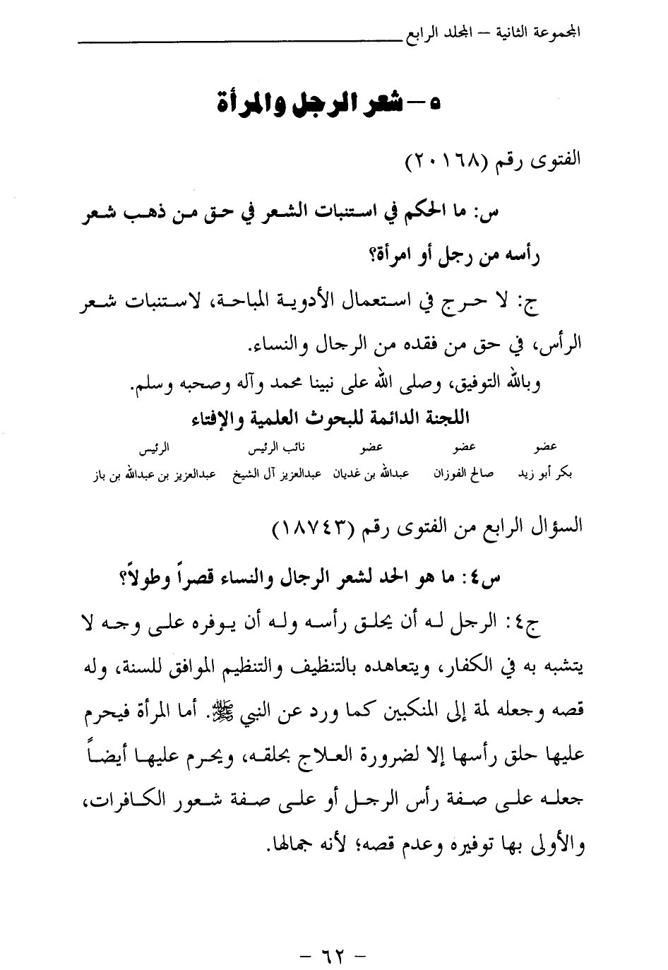 ج 4: الرجل له أن يحلق رأسه وله أن يوفره على وجه لا يتشبه به في الكفار، ويتعاهده بالتنظيف والتنظيم الموافق للسنة، وله قصه وجعله لمة إلى المنكبين كما ورد عن النبي صلى الله عليه وسلم أما المرأة فيحرم عليها حلق رأسها إلا لضرورة العلاج بحلقه، ويحرم عليها أيضا جعله على صفة رأس الرجل أو على صفة شعور الكافرات، والأولى بها توفيره وعدم قصه؟ لأنه جمالها.