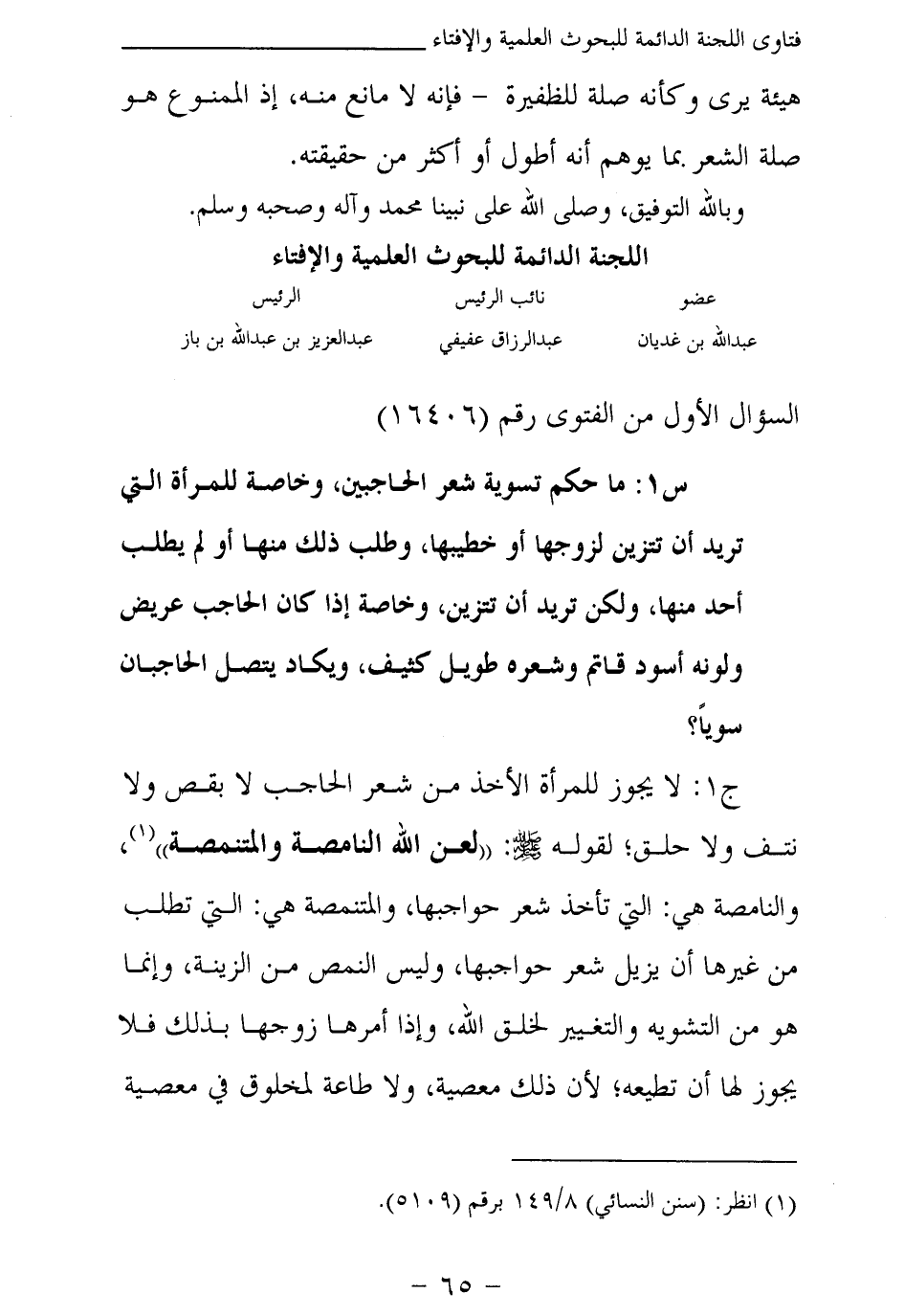 س 1: ما حكم تسوية شعر الحاجبين، وخاصة للمرأة التي تريد أن تتزين لزوجها أو خطيبها، وطلب ذلك منها أو لم يطلب أحد منها، ولكن تريد أن تتزين، وخاصة إذا كان الحاجب عريض ولونه أسود قاتم وشعره طويل كثيف، ويكاد يتصل الحاجبان سويا؟