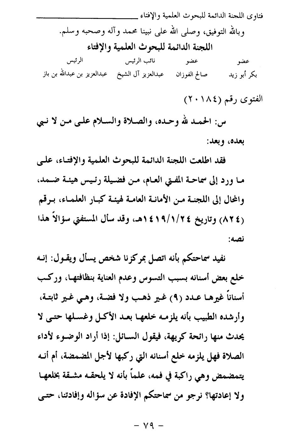 فقد اطلعت اللجنة الدائمة للبحوث العلمية والإفتاء على ما ورد إلى سماحة المفتي العام، من فضيلة رئيس هيئة ضمد، والمحال إلى اللجنة من الأمانة العامة لهيئة كبار العلماء، برقم (824) وتاريخ 24 \ 1 \ 1419هـ، وقد سأل المستفتي سؤالا هذا نصه: