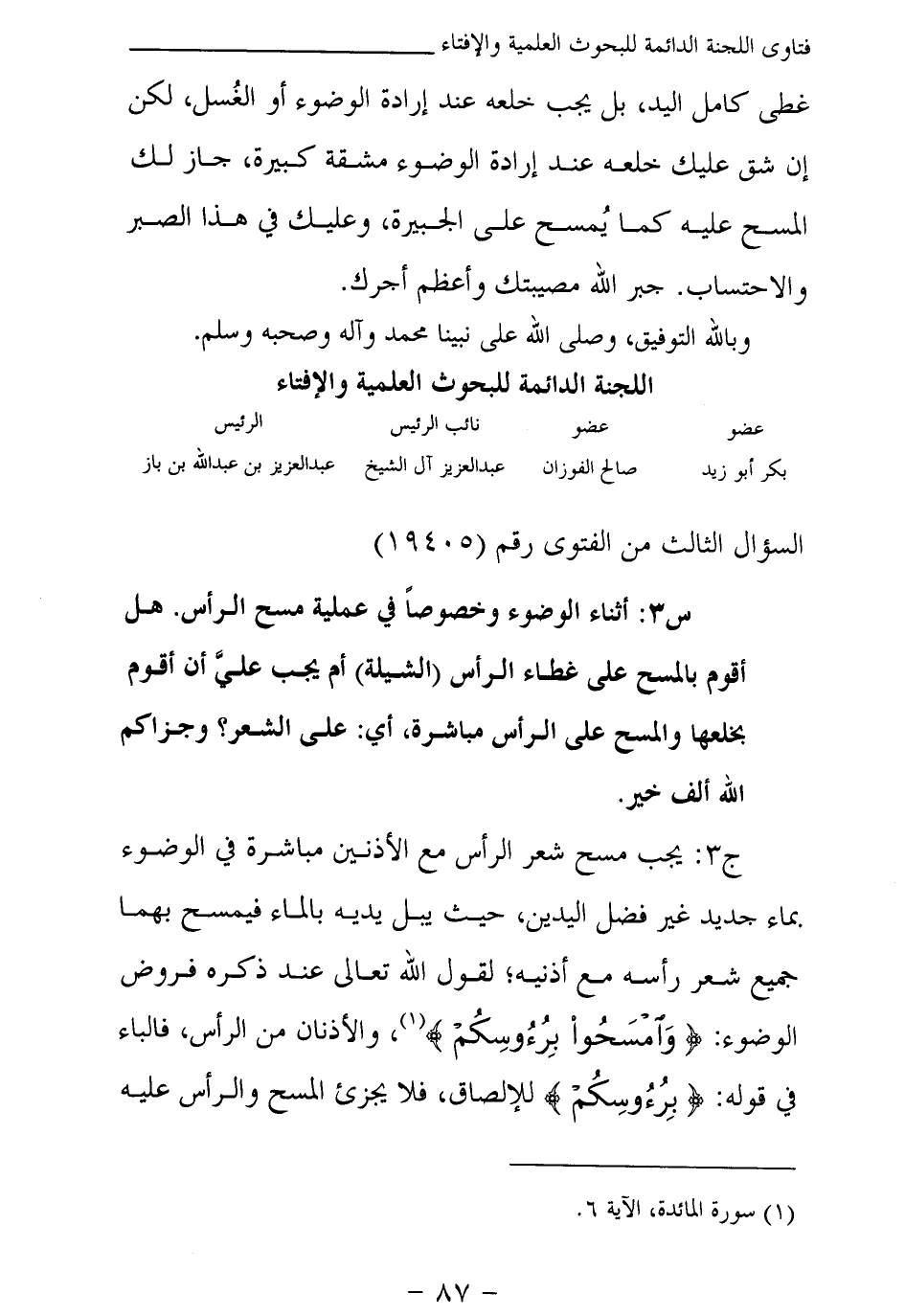 س 3: أثناء الوضوء وخصوصا في عملية مسح الرأس. هل أقوم بالمسح على غطاء الرأس (الشيلة) أم يجب علي أن أقوم بخلعها والمسح على الرأس مباشرة، أي: على الشعر؟ وجزاكم الله ألف خير.
