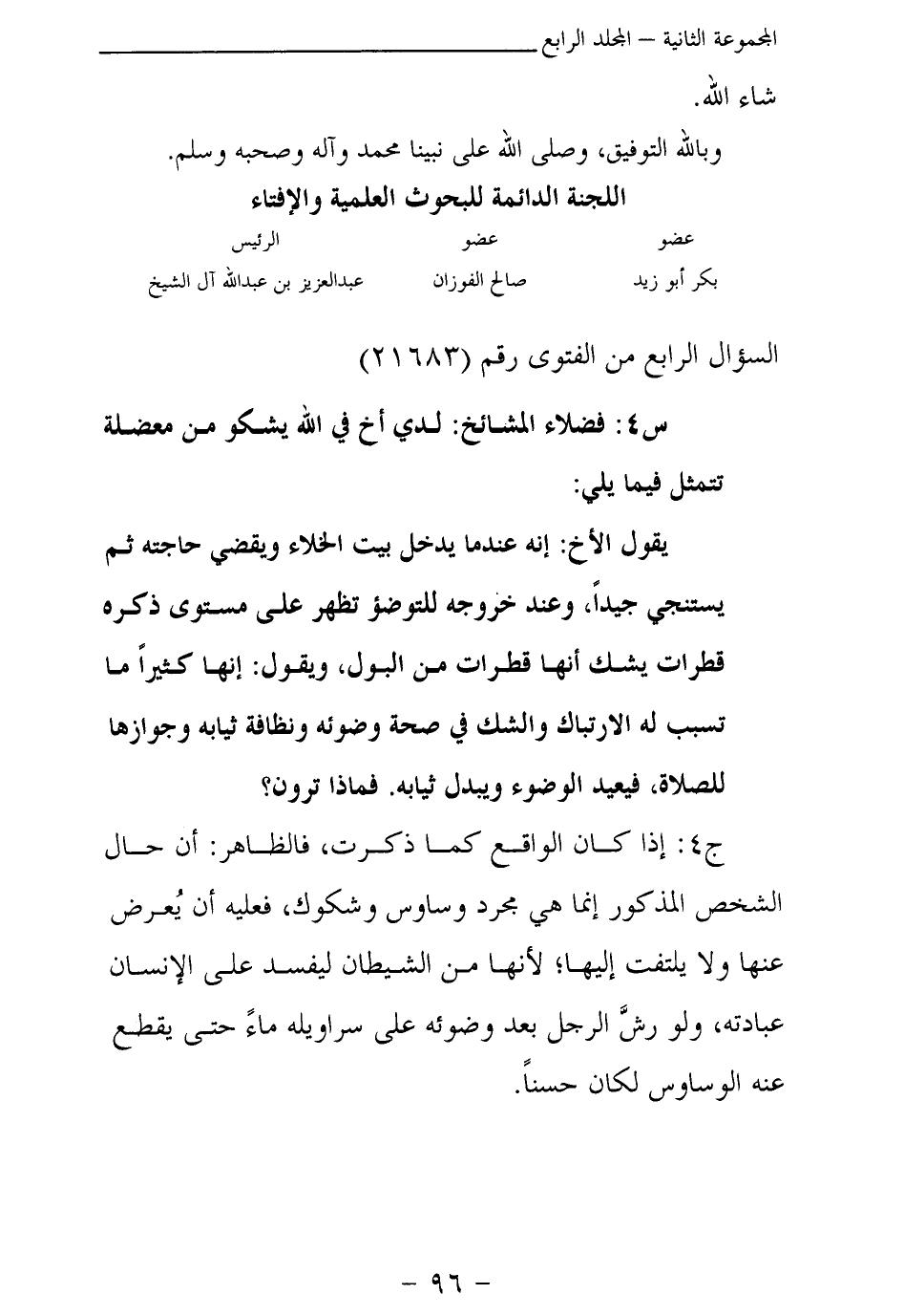 ج 4: إذا كان الواقع كما ذكرت، فالظاهر: أن حال الشخص المذكور إنما هي مجرد وساوس وشكوك، فعليه أن يعرض عنها ولا يلتفت إليها؛ لأنها من الشيطان ليفسد على الإنسان عبادته، ولو رش الرجل بعد وضوئه على سراويله ماء حتى يقطع عنه الوساوس لكان حسنا.