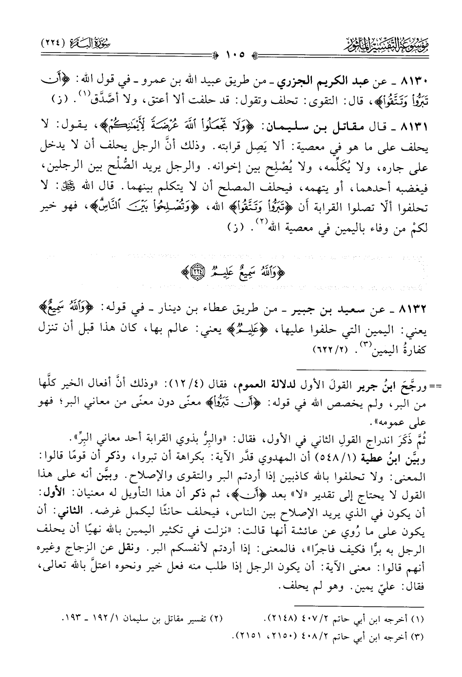 ٨١٣٢ - عن سعيد بن جبير -من طريق عطاء بن دينار- في قوله: {والله سميع} يعني: اليمين التي حلفوا عليها، {عليم} يعني: عالم بها، كان هذا قبل أن تنزل كفارةُ اليمين (¬٣). (٢/ ٦٢٢)