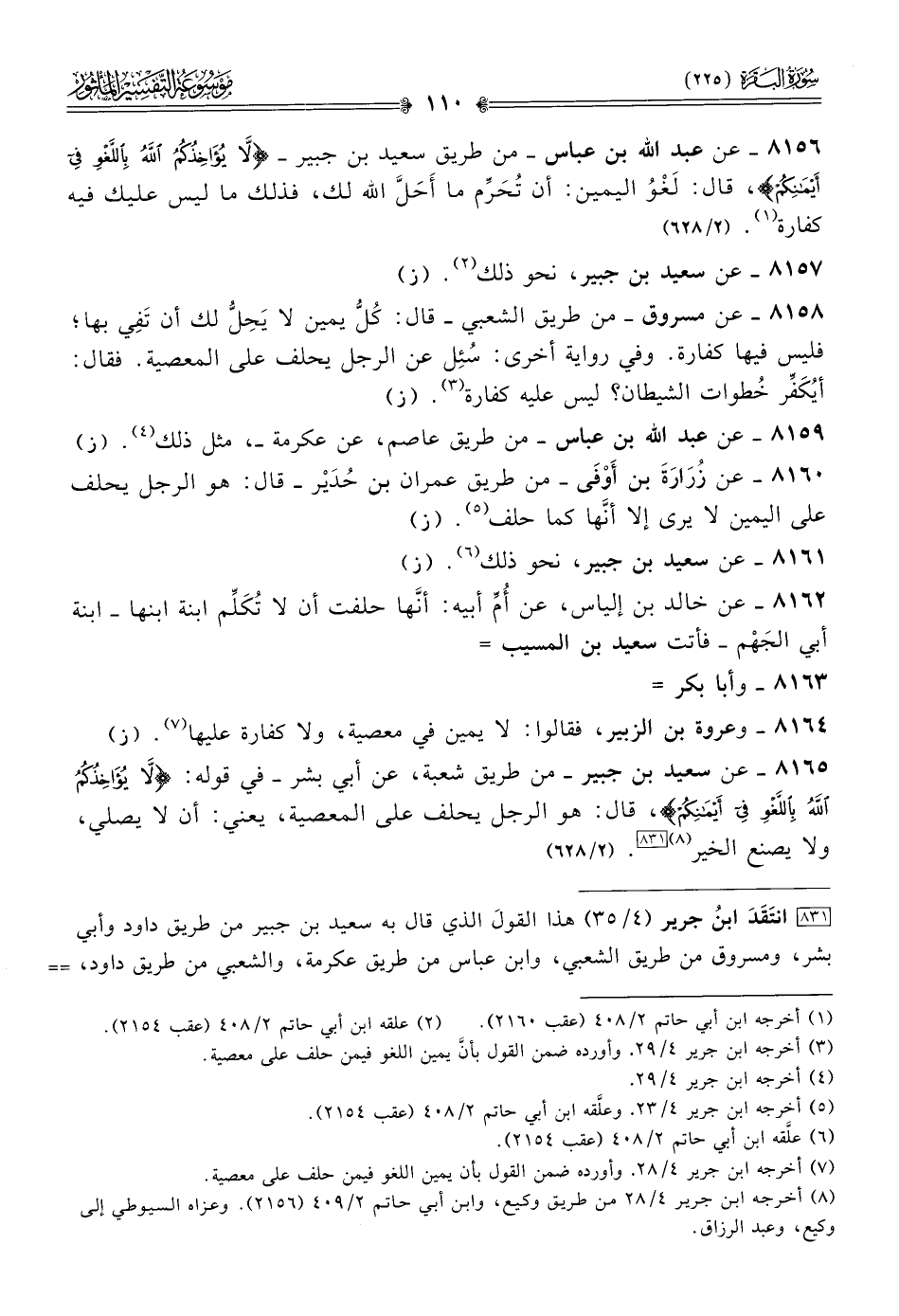 ٨١٦٥ - عن سعيد بن جبير -من طريق شعبة، عن أبي بشر- في قوله: {لا يؤاخذكم الله باللغو في أيمانكم}، قال: هو الرجل يحلف على المعصية، يعني: أن لا يصلي، ولا يصنع الخير (¬٨) [٨٣١]. (٢/ ٦٢٨)