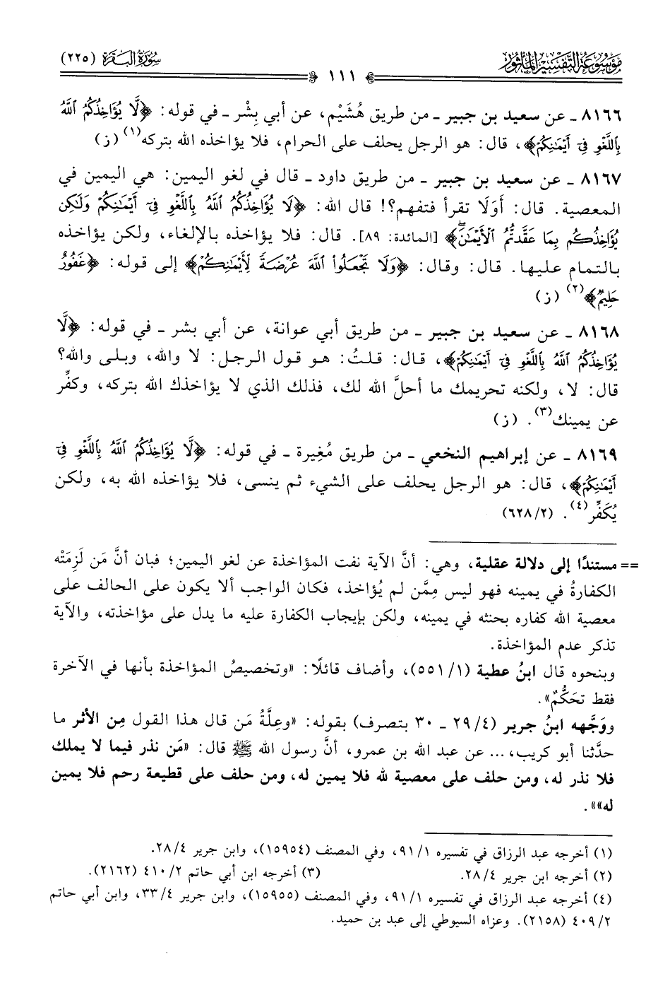 ٨١٦٧ - عن سعيد بن جبير -من طريق داود- قال في لغو اليمين: هي اليمين في المعصية. قال: أوَلا تقرأ فتفهم؟! قال الله: {لا يؤاخذكم الله باللغو في أيمانكم ولكن يؤاخذكم بما عقدتم الأيمان} [المائدة: ٨٩]. قال: فلا يؤاخذه بالإلغاء، ولكن يؤاخذه بالتمام عليها. قال: وقال {لا تجعلوا الله عرضة لأيمانكم} إلى قوله: {والله غفور حليم} (¬٢). (ز)
