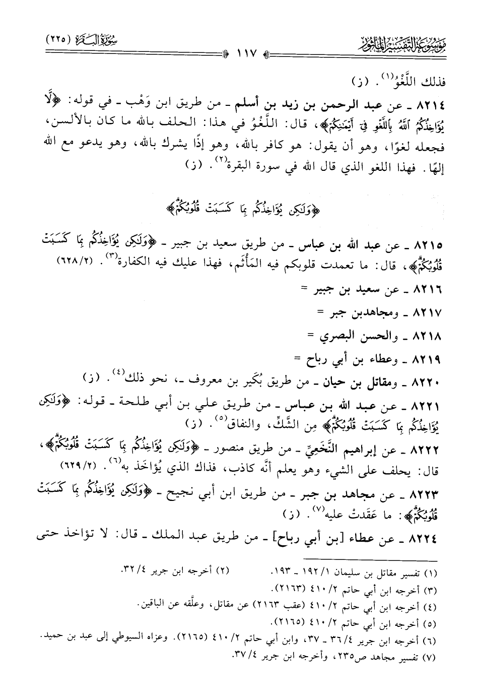 ٨٢١٥ - عن عبد الله بن عباس -من طريق سعيد بن جبير- {ولَكِنْ يُؤاخِذُكُمْ بِما كَسَبَتْ قُلُوبُكُمْ}، قال: ما تعمدت قلوبكم فيه المَأْثَم، فهذا عليك فيه الكفارة (¬٣). (٢/ ٦٢٨)