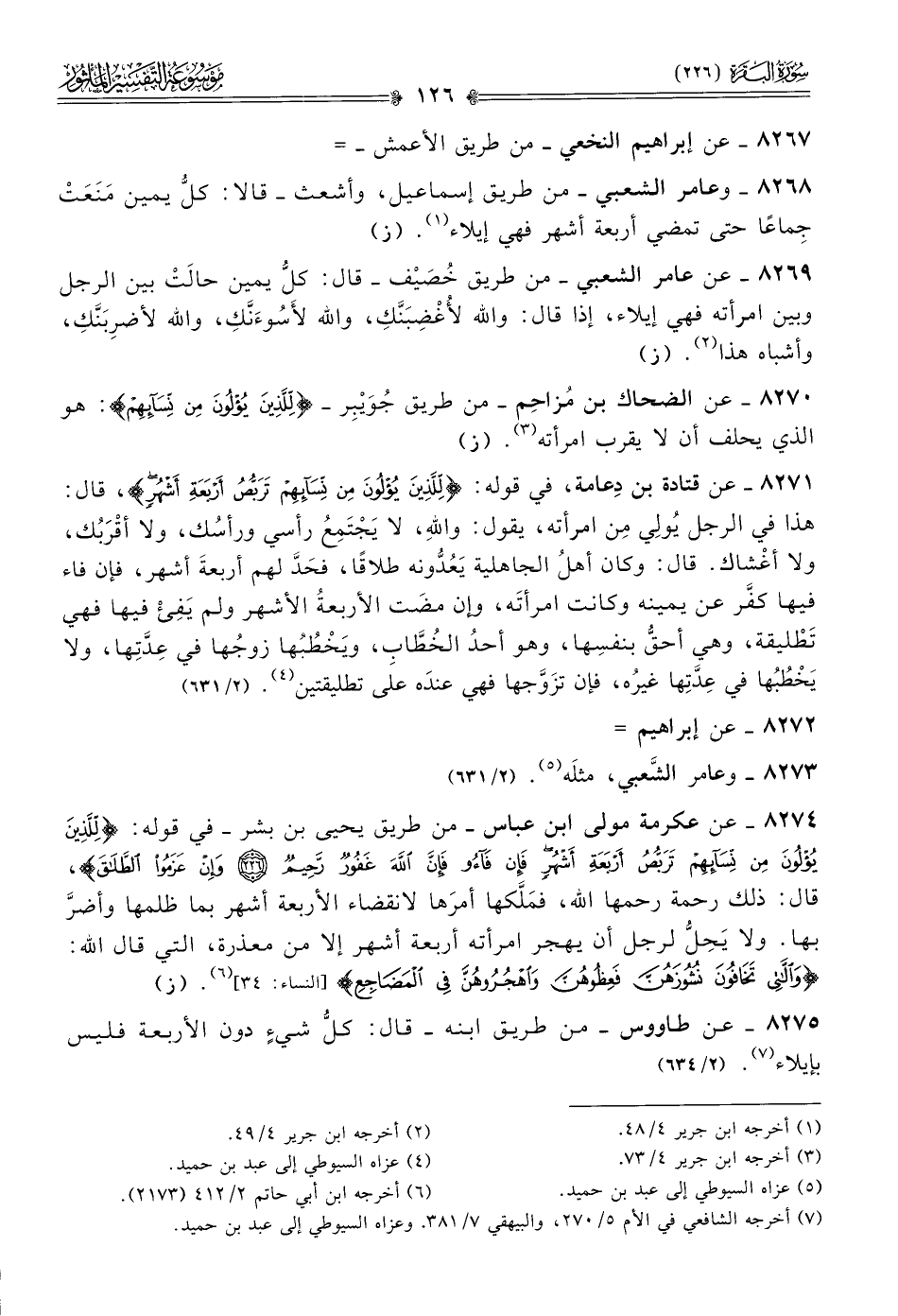 ٨٢٧٤ - عن عكرمة مولى ابن عباس -من طريق يحيى بن بشر- في قوله: {لِلَّذِينَ يُؤْلُونَ مِن نِسائِهِمْ تَرَبُّصُ أرْبَعَةِ أشْهُرٍ فان فاؤا فإن الله غفور رحيم وإن عزموا الطلاق}، قال: ذلك رحمة رحمها الله، فمَلَّكها أمرَها لانقضاء الأربعة أشهر بما ظلمها وأضرَّ بها. ولا يَحِلُّ لرجل أن يهجر امرأته أربعة أشهر إلا من معذرة، التي قال الله: {واللّاتِي تَخافُونَ نُشُوزَهُنَّ فَعِظُوهُنَّ واهْجُرُوهُنَّ فِي المَضاجِعِ} [النساء: ٣٤] (¬٦). (ز)