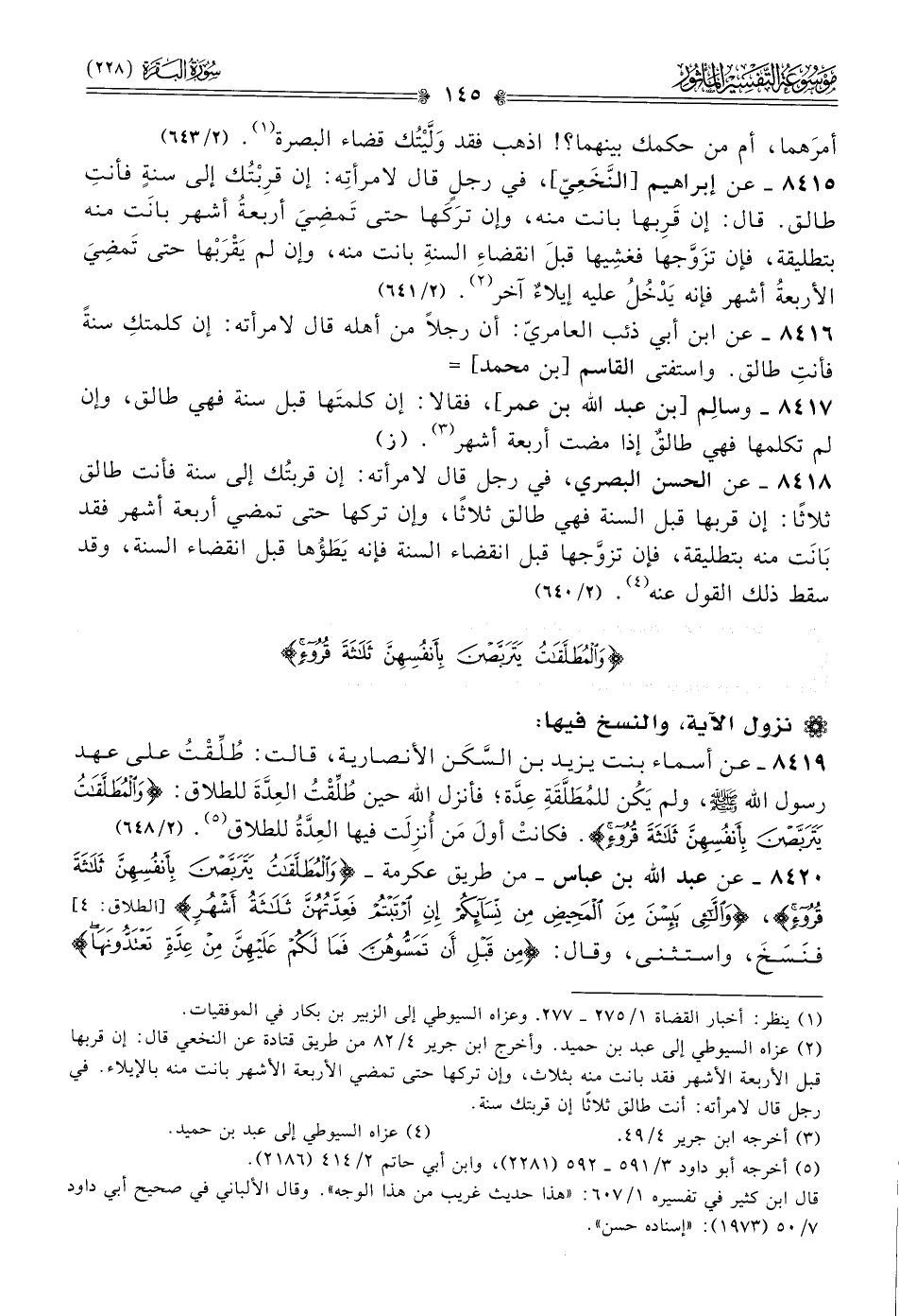 ٨٤٢٠ - عن عبد الله بن عباس -من طريق عكرمة- {والمطلقات يتربصن بأنفسهن ثلاثة قروء}، {واللائي يئسن من المحيض من نسائكم إن ارتبتم فعدتهن ثلاثة أشهر} [الطلاق: ٤] فنَسَخَ، واستثنى، وقال: {من قبل أن تمسوهن فما لكم عليهن من عدة تعتدونها}