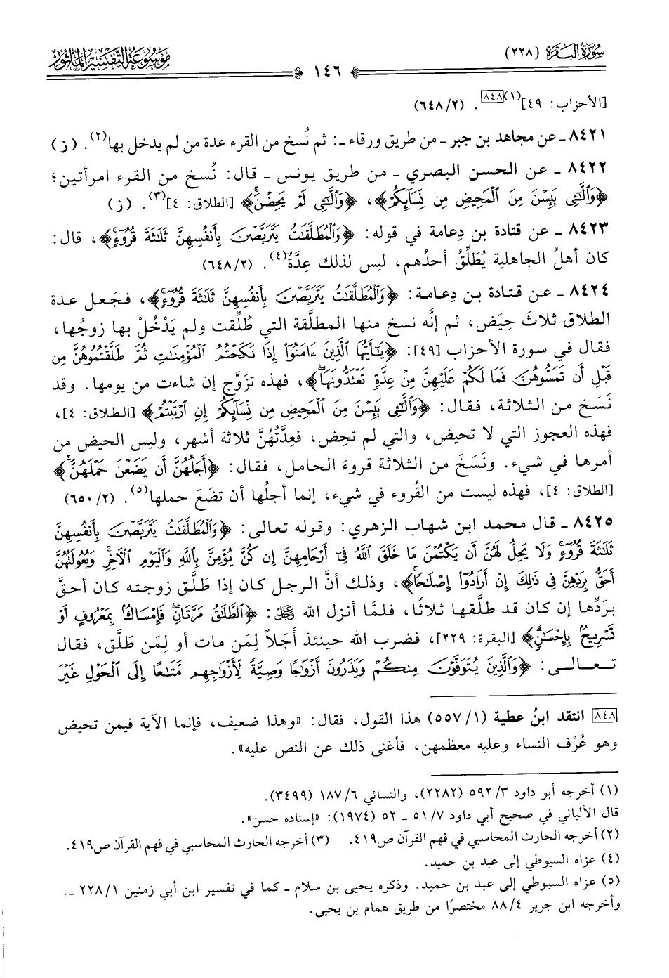 ٨٤٢٤ - عن قتادة بن دِعامة: {والمطلقات يتربصن بأنفسهن ثلاثة قروء}، فجَعل عدة الطلاق ثلاثَ حِيَض، ثم إنّه نسخ منها المطلَّقة التي طُلِّقت ولم يَدْخُلْ بها زوجُها، فقال في سورة الأحزاب [٤٩]: {يا أيها الذين آمنوا إذا نكحتم المؤمنات ثم طلقتموهن من قبل أن تمسوهن فما لكم عليهن من عدة تعتدونها}، فهذه تزَوَّج إن شاءت من يومها. وقد نَسَخ من الثلاثة، فقال: {واللاتي يئسن من المحيض من نسائكم إن ارتبتم} [الطلاق: ٤]، فهذه العجوز التي لا تحيض، والتي لم تحِض، فعِدَّتُهُنَّ ثلاثة أشهر، وليس الحيض من أمرها في شيء. ونَسَخَ من الثلاثة قروءَ الحامل، فقال: {أجلهن أن يضعن حملهن} [الطلاق: ٤]، فهذه ليست من القُروء في شيء، إنما أجلُها أن تضَعَ حملها (¬٥). (٢/ ٦٥٠)