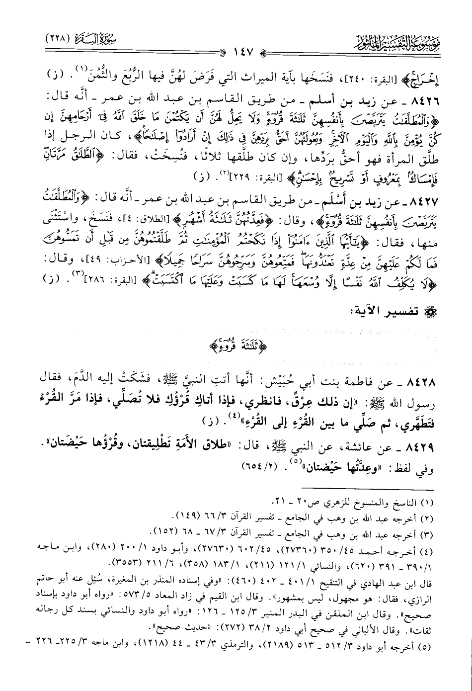 ٨٤٢٦ - عن زيد بن أسلم -من طريق القاسم بن عبد الله بن عمر- أنّه قال: {والمطلقات يتربصن بأنفسهن ثلاثة قروء ولا يحل لهن أن يكتمن ما خلق الله في أرحامهن إن كن يؤمن بالله واليوم الآخر وبعولتهن أحق بردهن في ذلك إن أرادوا إصلاحا}، كان الرجل إذا طلَّق المرأة فهو أحقُّ برَدِّها، وإن كان طلَّقها ثلاثًا، فنُسِخَتْ، فقال: {الطلاق مرتان فإمساك بمعروف أو تسريح بإحسان} [البقرة: ٢٢٩] (¬٢). (ز)