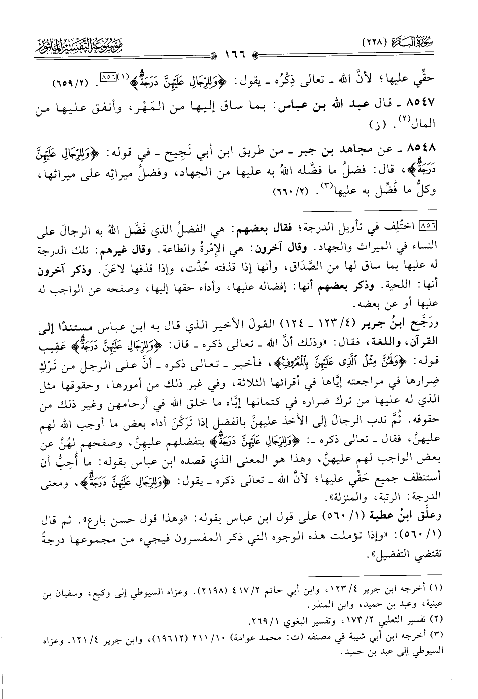 [٨٥٦] اختُلِف في تأويل الدرجة؛ فقال بعضهم: هي الفضلُ الذي فَضَّل اللهُ به الرجالَ على النساء في الميراث والجهاد. وقال آخرون: هي الإمْرةُ والطاعة. وقال غيرهم: تلك الدرجة له عليها بما ساق لها من الصَّداق، وأنها إذا قذفته حُدَّت، وإذا قذفها لاعَنَ. وذكر آخرون أنها: اللحية. وذكر بعضهم أنها: إفضاله عليها، وأداء حقها إليها، وصفحه عن الواجب له عليها أو عن بعضه.