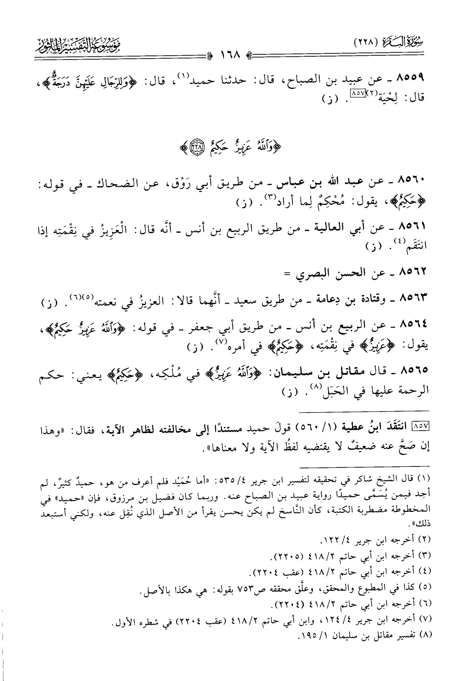 ٨٥٦٤ - عن الربيع بن أنس -من طريق أبي جعفر- في قوله: {والله عزيز حكيم}، يقول: {عزيز} في نِقْمَتِه، {حكيم} في أمره (¬٧). (ز)