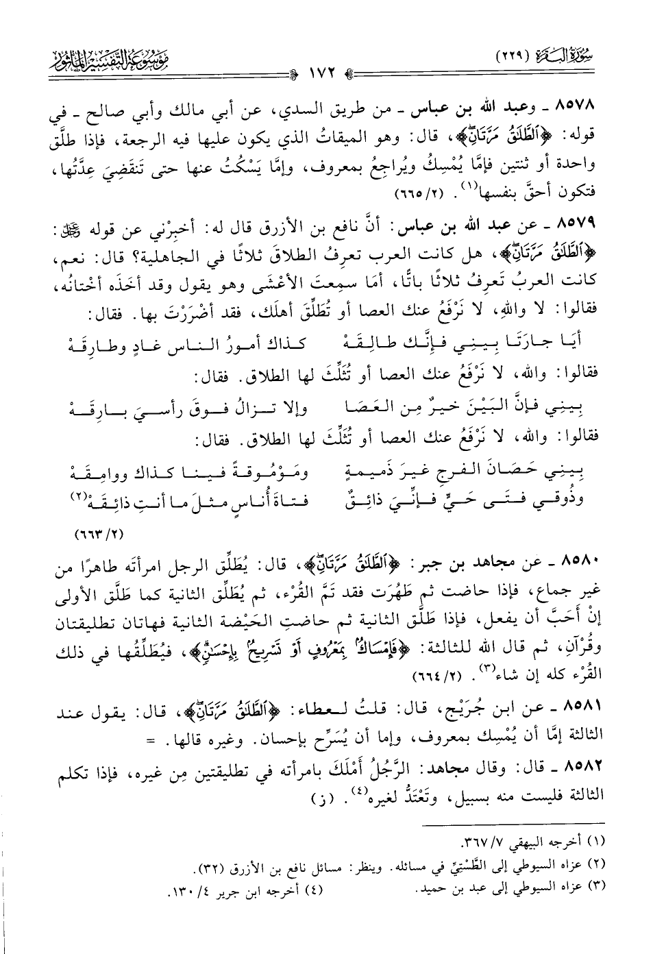 ٨٥٨١ - عن ابن جُرَيْج، قال: قلتُ لعطاء: {الطلاق مرتان}، قال: يقول عند الثالثة إمّا أن يُمْسِك بمعروف، وإما أن يُسَرِّح بإحسان. وغيره قالها. =