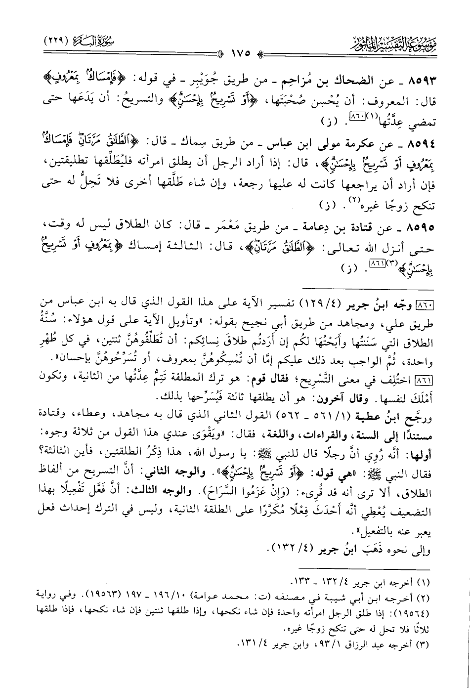 [٨٦٠] وجّه ابنُ جرير (٤/ ١٢٩) تفسير الآية على هذا القول الذي قال به ابن عباس من طريق علي، ومجاهد من طريق أبي نجيح بقوله: «وتأويل الآية على قول هؤلاء: سُنَّةُ الطلاق التي سَنَنتُها وأَبَحْتُها لكُم إن أرَدتُم طلاقَ نِسائِكم: أن تُطَلِّقُوهُنَّ ثنتين، في كل طُهْرِ واحدة، ثُمَّ الواجب بعد ذلك عليكم إمّا أن تُمْسِكُوهُنَّ بمعروف، أو تُسَرِّحُوهُنَّ بإحسان».