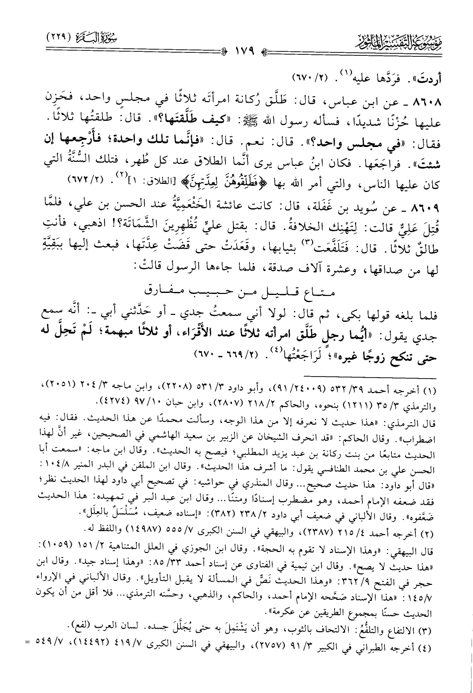 ٨٦٠٨ - عن ابن عباس، قال: طَلَّق رُكانة امرأتَه ثلاثًا في مجلسٍ واحد، فحَزِن عليها حُزْنًا شديدًا، فسأله رسول الله - صلى الله عليه وسلم -: «كيف طَلَّقتَها؟». قال: طلقتُها ثلاثًا. فقال: «في مجلس واحد؟». قال: نعم. قال: «فإنّما تلك واحدة؛ فأَرْجِعها إن شئتَ». فراجَعَها. فكان ابنُ عباس يرى أنّما الطلاق عند كل طُهر، فتلك السُّنَّةُ التي كان عليها الناس، والتي أمر الله بها {فطلقوهن لعدتهن} [الطلاق: ١] (¬٢). (٢/ ٦٧٢)