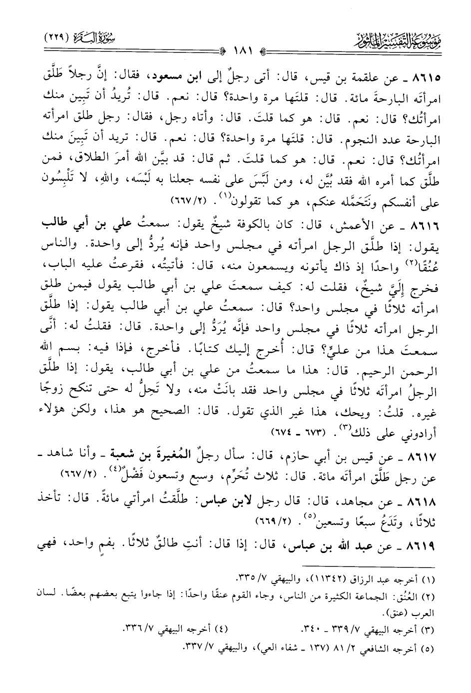 ٨٦١٧ - عن قيس بن أبي حازم، قال: سأل رجلٌ المُغيرةَ بن شعبة -وأنا شاهد- عن رجل طَلَّق امرأتَه مائة. قال: ثلاث تُحَرِّم، وسبع وتسعون فَضْلٌ (¬٤). (٢/ ٦٦٧)