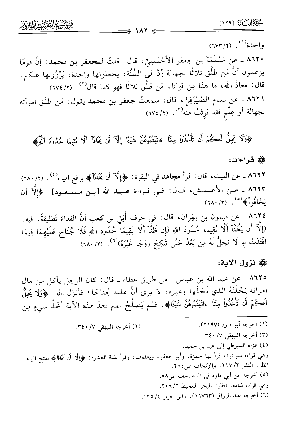٨٦٢٤ - عن ميمون بن مِهْران، قال: في حرفِ أُبَيِّ بن كعب أنّ الفداءَ تَطليقةٌ، فيه: (إلَّآ أن يَظُنَّآ ألّا يُقِيما حُدُودَ اللهِ فَإن ظَنَّآ ألّا يُقِيما حُدُودَ اللهِ فَلا جُناحَ عَلَيْهِما فِيما افْتَدَتْ بِهِ لا تَحِلُّ لَهُ مِن بَعْدُ حَتّى تَنكِحَ زَوْجًا غَيْرَهُ) (¬٦). (٢/ ٦٨٠)