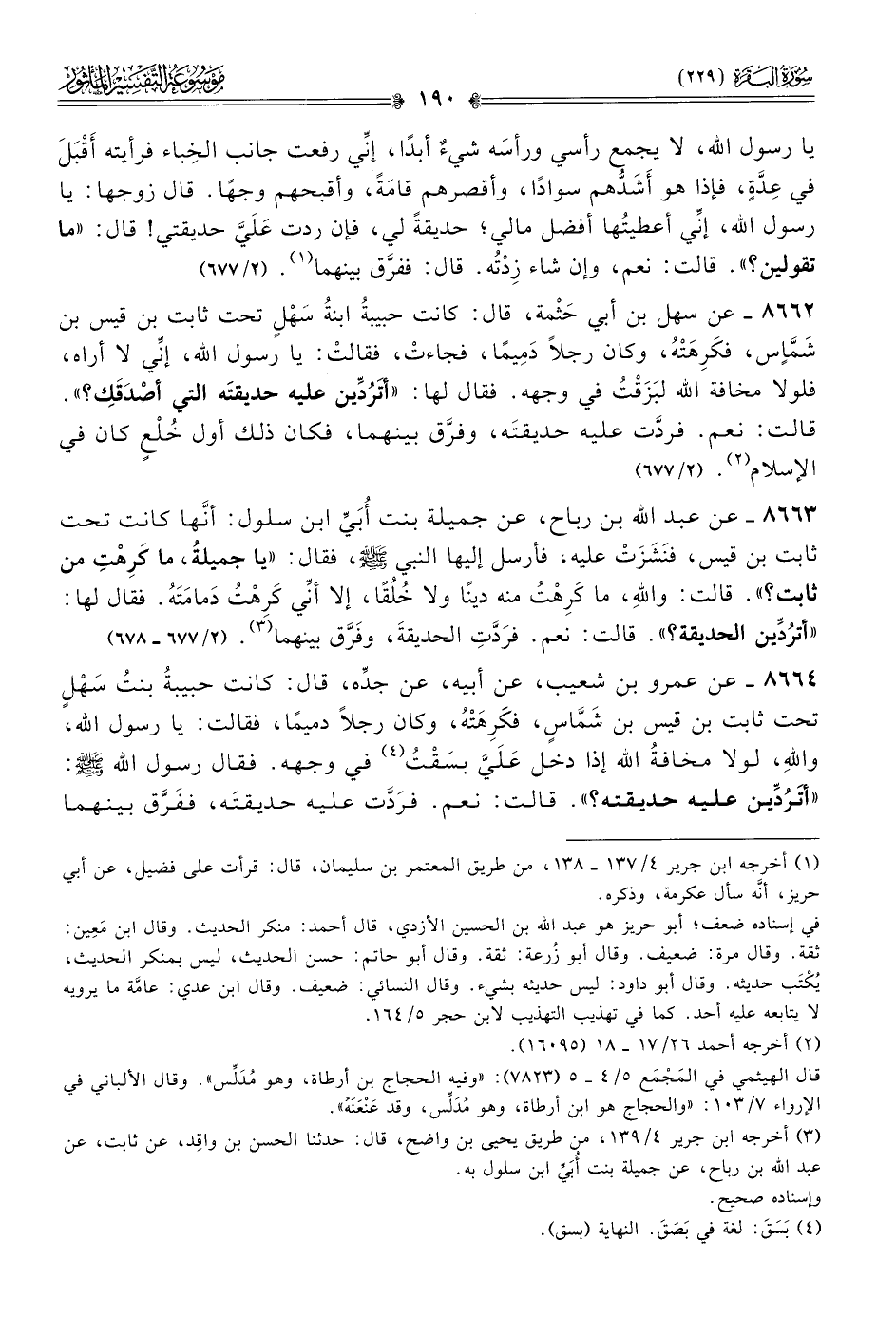 ٨٦٦٤ - عن عمرو بن شعيب، عن أبيه، عن جدِّه، قال: كانت حبيبةُ بنتُ سَهْلٍ تحت ثابت بن قيس بن شَمّاسٍ، فكَرِهَتْهُ، وكان رجلًا دميمًا، فقالت: يا رسول الله، واللهِ، لولا مخافةُ الله إذا دخل عَلَيَّ بسَقْتُ (¬٤) في وجهه. فقال رسول الله - صلى الله عليه وسلم -: «أتَرُدِّين عليه حديقته؟». قالت: نعم. فرَدَّت عليه حديقتَه، ففَرَّق بينهما
