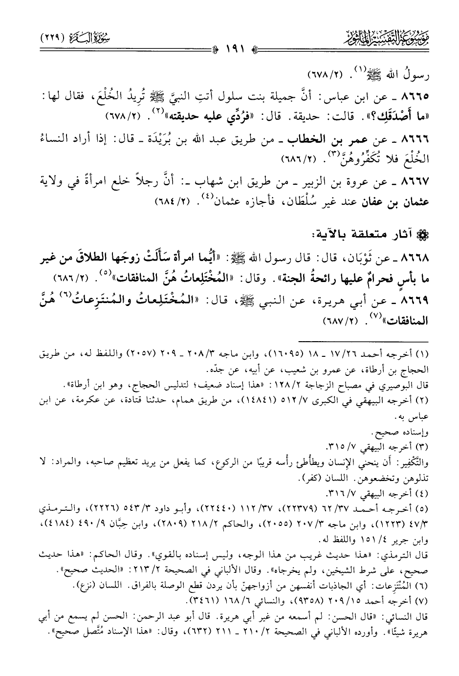 ٨٦٦٩ - عن أبي هريرة، عن النبي - صلى الله عليه وسلم -، قال: «المُخْتَلِعاتُ والمُنتَزِعاتُ (¬٦) هُنَّ المنافقات» (¬٧). (٢/ ٦٨٧)