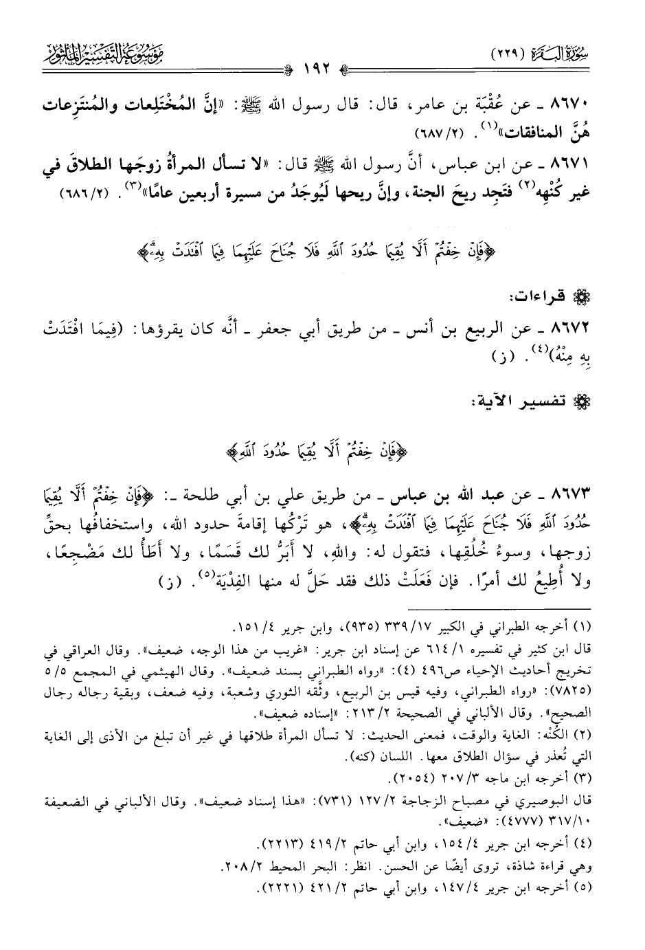 ٨٦٧٢ - عن الربيع بن أنس -من طريق أبي جعفر- أنّه كان يقرؤها: (فِيما افْتَدَتْ بِهِ مِنهُ) (¬٤). (ز)
