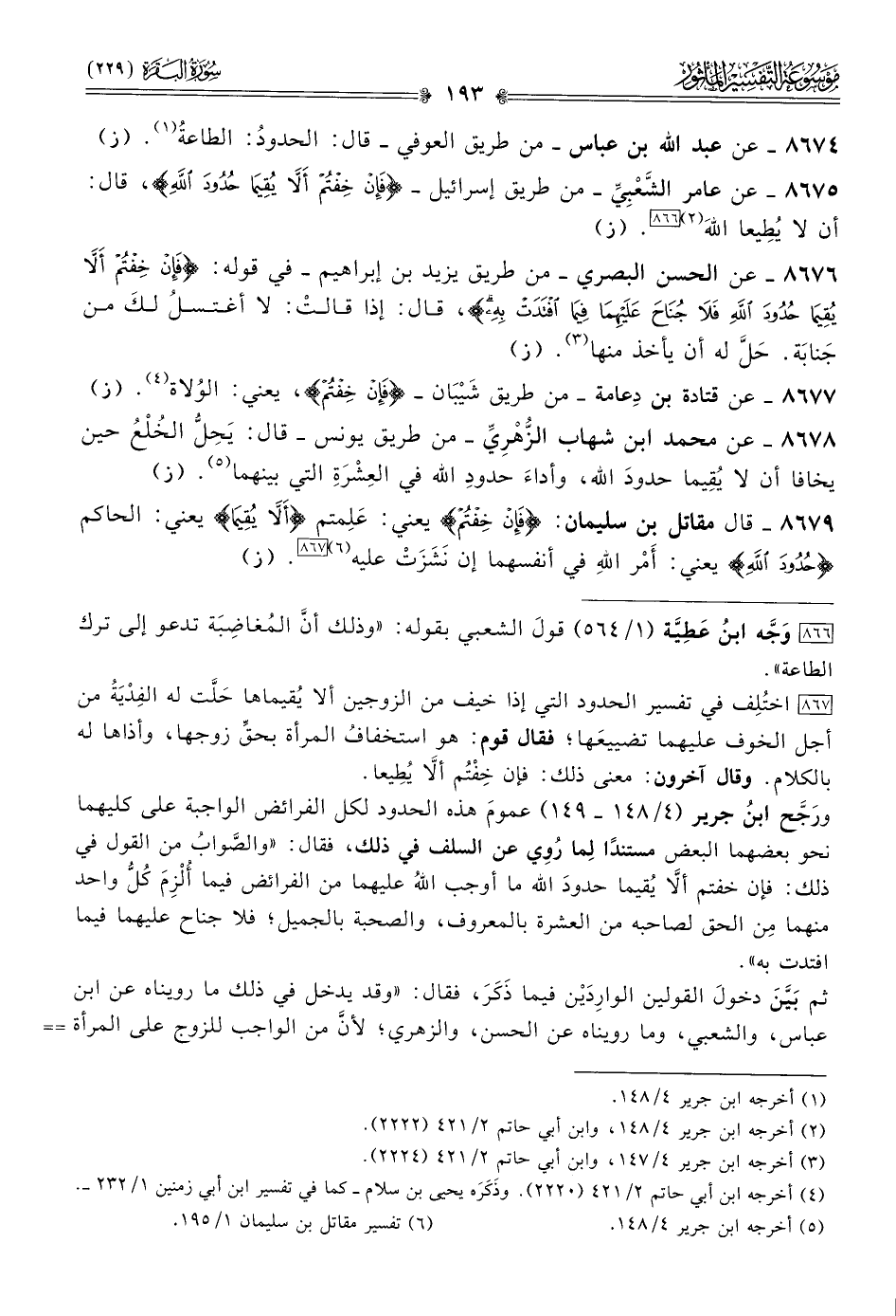٨٦٧٥ - عن عامر الشَّعْبِيِّ -من طريق إسرائيل- {فَإنْ خِفْتُمْ ألا يُقِيما حُدُودَ اللَّهِ}، قال: أن لا يُطِيعا اللهَ (¬٢) [٨٦٦]. (ز)