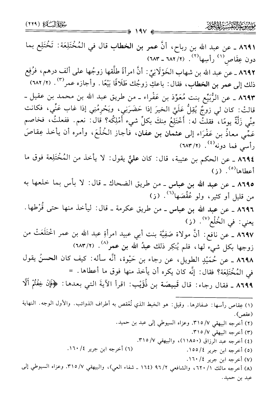 ٨٦٩٧ - عن نافع: أنّ مولاة صَفِيَّة بنت أبي عبيد امرأةِ عبد الله بن عمر اخْتَلَعَتْ من زوجها بكل شيء لها، فلم يُنكِر ذلك عبدُ الله بن عمر (¬٨). (٢/ ٦٨٣)