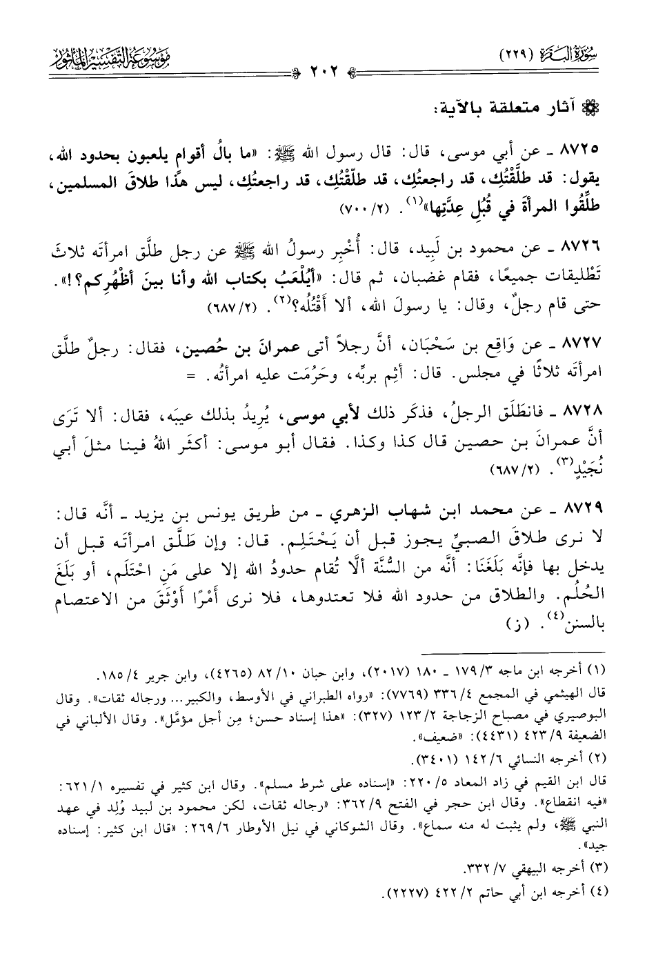 ٨٧٢٥ - عن أبي موسى، قال: قال رسول الله - صلى الله عليه وسلم -: «ما بالُ أقوامٍ يلعبون بحدود الله، يقول: قد طلَّقْتُكِ، قد راجعتُكِ، قد طلّقْتُكِ، قد راجعتُكِ، ليس هذا طلاقَ المسلمين، طلِّقُوا المرأةَ في قُبُلِ عِدَّتِها» (¬١). (٢/ ٧٠٠)