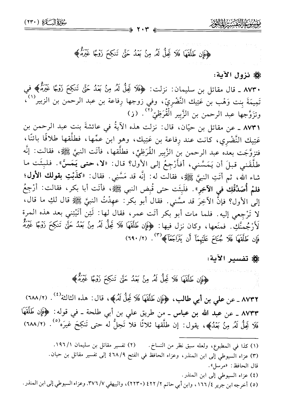 ٨٧٣٠ - قال مقاتل بن سليمان: نزلت: {فَلا تَحِلُّ لَهُ مِن بَعْدُ حَتّى تَنْكِحَ زَوْجًا غَيْرَهُ} في تَمِيمَةَ بِنت وهْب بن عَتِيك النَّضْرِيّ، وفي زوجها رِفاعة بن عبد الرحمن بن الزبير (¬١)، وتزَوَّجها عبد الرحمن بن الزَّبِير القُرَظِيّ (¬٢). (ز)