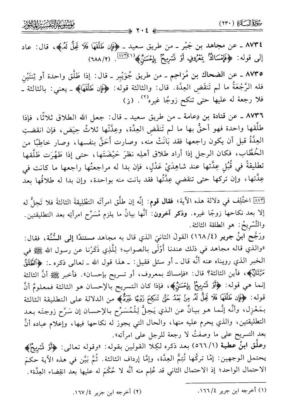 ورَجَّح ابنُ جرير (٤/ ١٦٨) القولَ الثانيَ الذي قال به مجاهد مستندًا إلى السُّنَّة، فقال: «والذي قاله مجاهد في ذلك عندنا أوْلى بالصواب؛ لِلَّذِي ذَكَرْنا عن رسول الله - صلى الله عليه وسلم - في الخبر الذي رويناه عنه أنّه قال -أو سئل فقيل: - هذا قول الله -تعالى ذكره-: {الطلاق مرتان}، فأين الثالثة؟ قال: «فإمساك بمعروف، أو تسريح بإحسان». فأخبر - صلى الله عليه وسلم - أنّ الثالثة إنما هي قوله: {أو تسريح بإحسان}، فإذا كان التسريح بالإحسان هو الثالثة فمعلومٌ أنّ قوله: {فإن طلقها فلا تحل له من بعد حتى تنكح زوجا غيره} من الدلالة على التطليقة الثالثة بمَعْزِل، وأنّه إنّما هو بيانٌ عن الذي يَحِلُّ لِلْمُسَرِّح بالإحسان إن سَرَّح زوجتَه بعد التطليقتين، والذي يحرم عليه منها، والحال التي يجوز له نكاحها فيها، وإعلام عباده أنّ بعد التسريح على ما وصفتُ لا رجعة للرجل على امرأته».